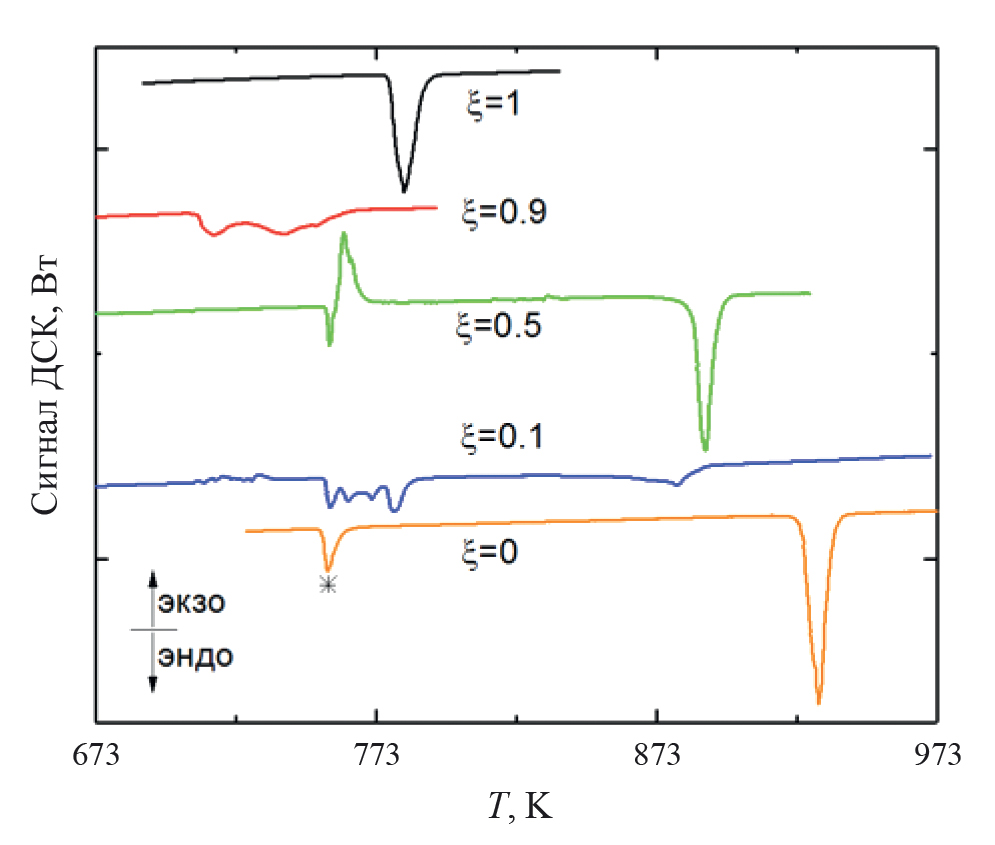 Рис. 1. ДСК-кривые плавления смесей (1–ξ) CsCl–ξPbCl2 различного состава. Звездочкой отмечен фазовый переход в CsCl.