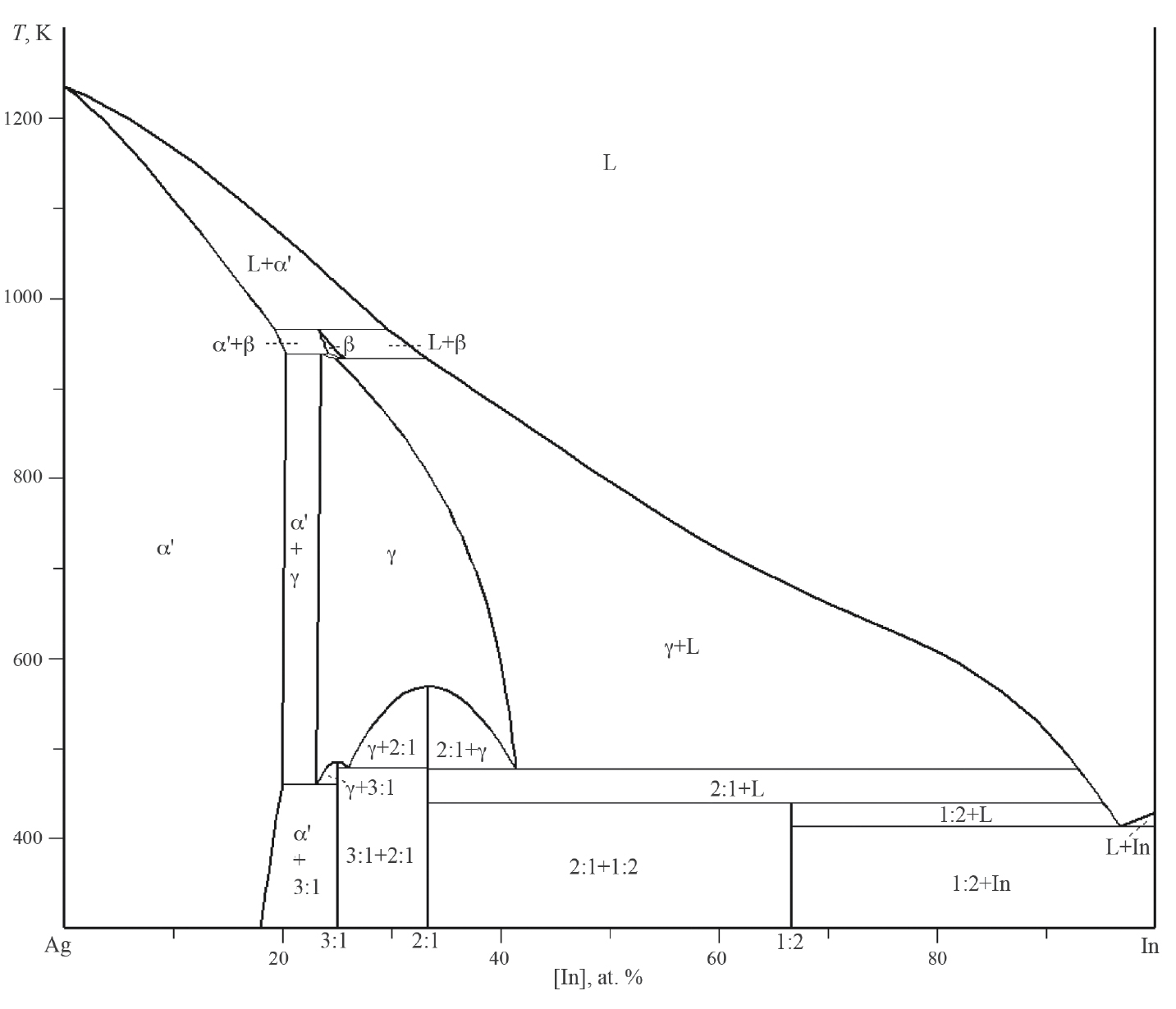 В системе Ag–In помимо жидкости и твердых растворов α', β, γ (они имеют такую же структуру, что и растворы α', β, γ в системе Ag–Al) существуют соединения Ag3In, Ag2In и AgIn2. В дальнейшем для краткости они будут обозначаться символами 3:1, 2:1 и 1:2 в соответствии с числом атомов Ag и In в этих соединениях.