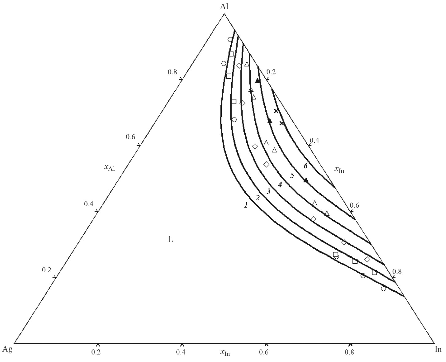 В работах [4, 6] путем изотермического отжига образцов с последующим определением их состава, найдены границы области несмешиваемости жидкости при 923–1173 К. В работах [5–7] методом ДТА определены температуры ликвидуса и температуры фазовых переходов в субсолидусной области (при этом неизвестно, к каким фазовым равновесиям они относятся) для политермических сечений wAl/wIn = 1 (это эквивалентно xAl/xIn = 4.255; символы wk и xk обозначают массовые и мольные доли компонентов соответственно), wAg/wIn = 1 (xAg/xIn = 1.064) и wIn/wAl = 89.92/10.08 (xIn/xAl = 2.096). Тройные соединения в системе Ag–Al–In по данным [4–7] отсутствуют.