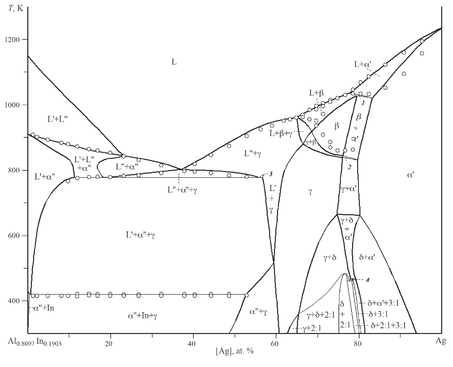 Рис. 4. Политермическое сечение xAl / xIn = 4.255 фазовой диаграммы системы Ag–Al–In. Линии – расчет, точки – экспериментальные данные [5–7]; цифрами обозначены области сосуществования фаз: L + α' + β (1), α' + β + γ (2), L' + L" + γ (3), γ + δ + 3:1 (4).