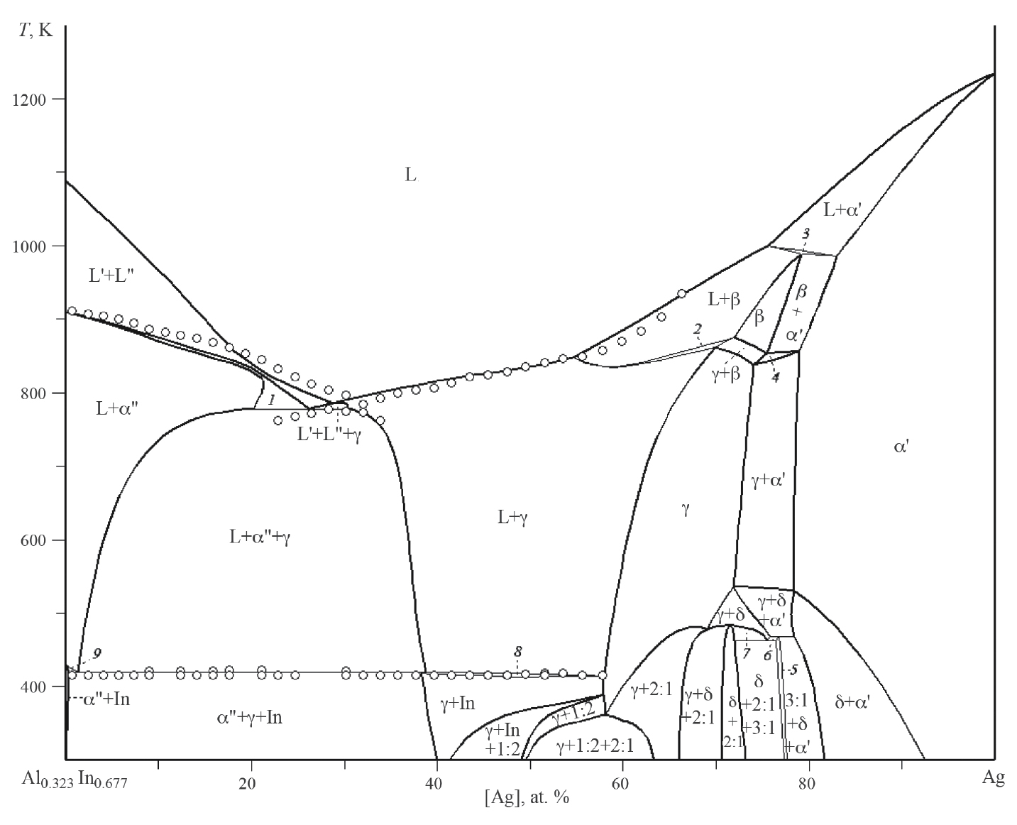 Рис. 5. Политермическое сечение xIn / xAl = 2.096 фазовой диаграммы системы Ag–Al–In. Линии – расчет, точки –экспериментальные данные [5–7]; цифрами обозначены области сосуществования фаз: L' + L" + α" (1), L + β + γ (2), L + α' + β (3), α' + β + γ (4), δ + 3:1 (5), γ + δ + 3:1 (6), γ + δ + 2:1 (7), L + γ + In (8), L" + α" + In (9).