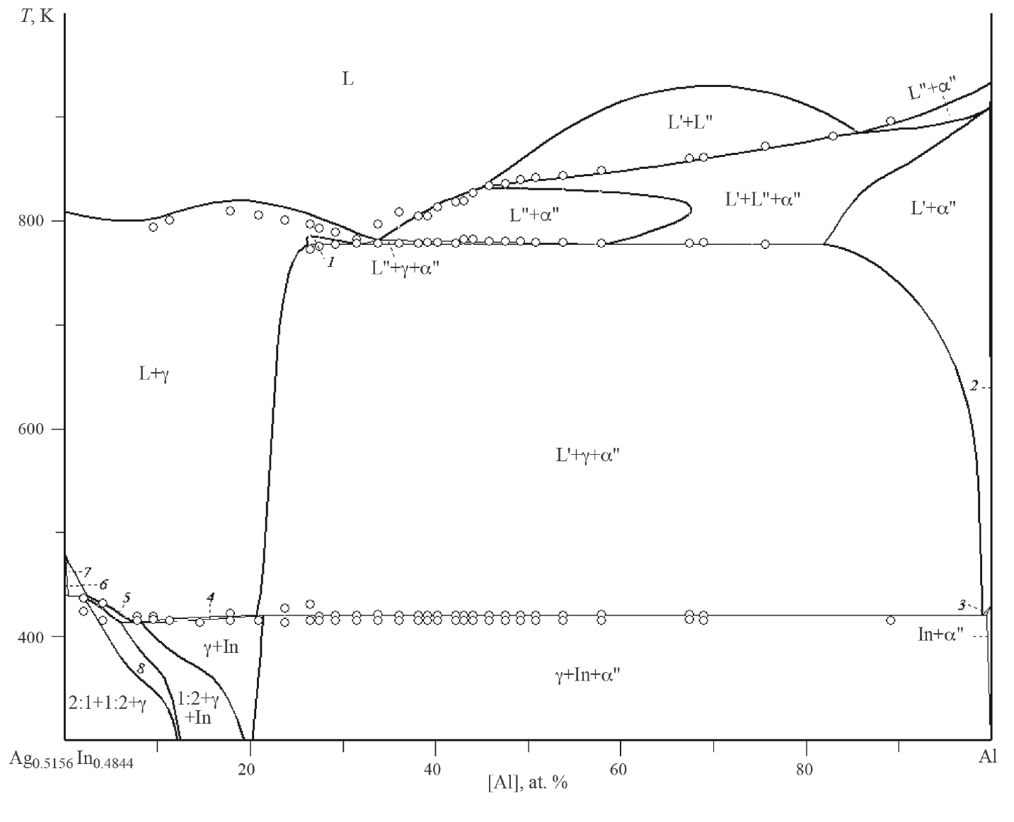 Рис. 6. Политермическое сечение xAg / xIn = 1.064 фазовой диаграммы системы Ag–Al–In. Линии – расчет, точки – экспериментальные данные [5–7]; цифрами обозначены области сосуществования фаз: L’ + L” + α” (1), α” (2), L’ + α” + In (3), L + γ + In (4), L + γ + 1:2 (5), L + 2:1 (6), L + γ + 2:1 (7), γ + 1:2 (8).