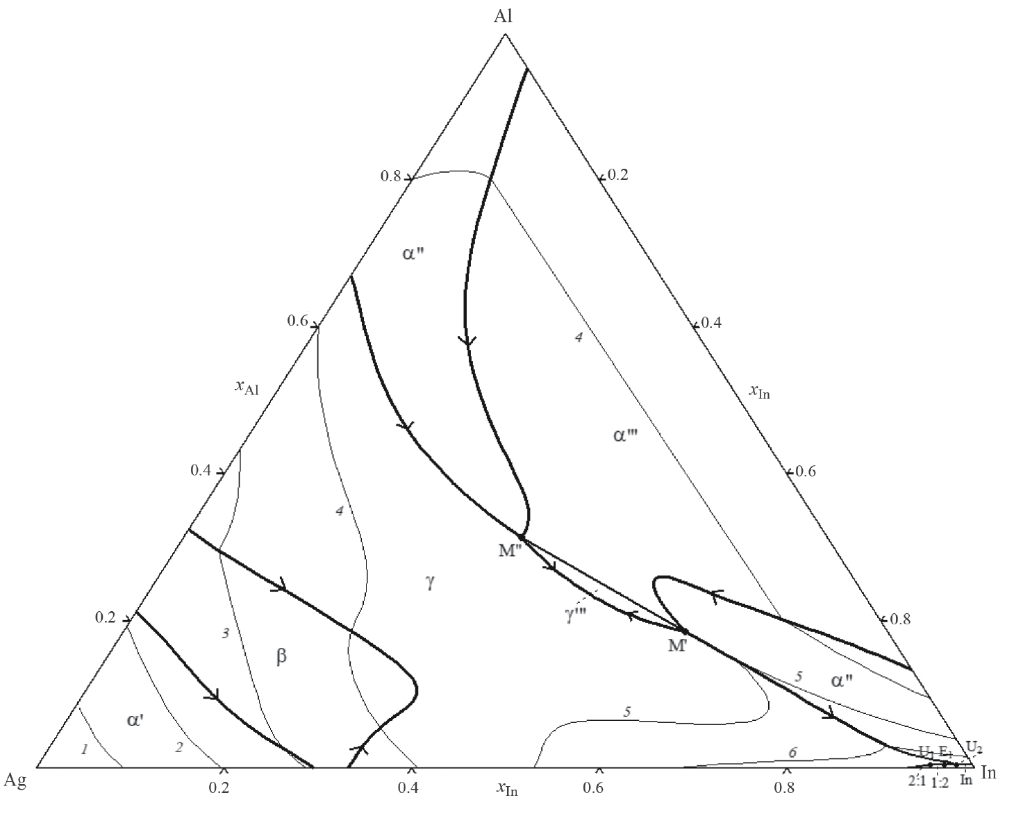 Рассчитанная проекция поверхности ликвидуса системы Ag–Al–In приведена на рис. 7, где толстые линии относятся к моновариантным равновесиям, а тонкие линии обозначают изотермы ликвидуса при 673–1173 К. Точки, расположенные на пересечении толстых линий, соответствуют нонвариантным равновесиям, координаты которых представлены в табл. 2. Из этих равновесий три относятся к переходному типу и по одному к монотектическому, эвтектическому и эвтектоидному. Символы М' и М" относятся к составу жидкостей L' и L" в монотектическом равновесии. Символы α'" и γ'" обозначают области первичной кристаллизации фаз α” и γ из двухфазной области L' + L".