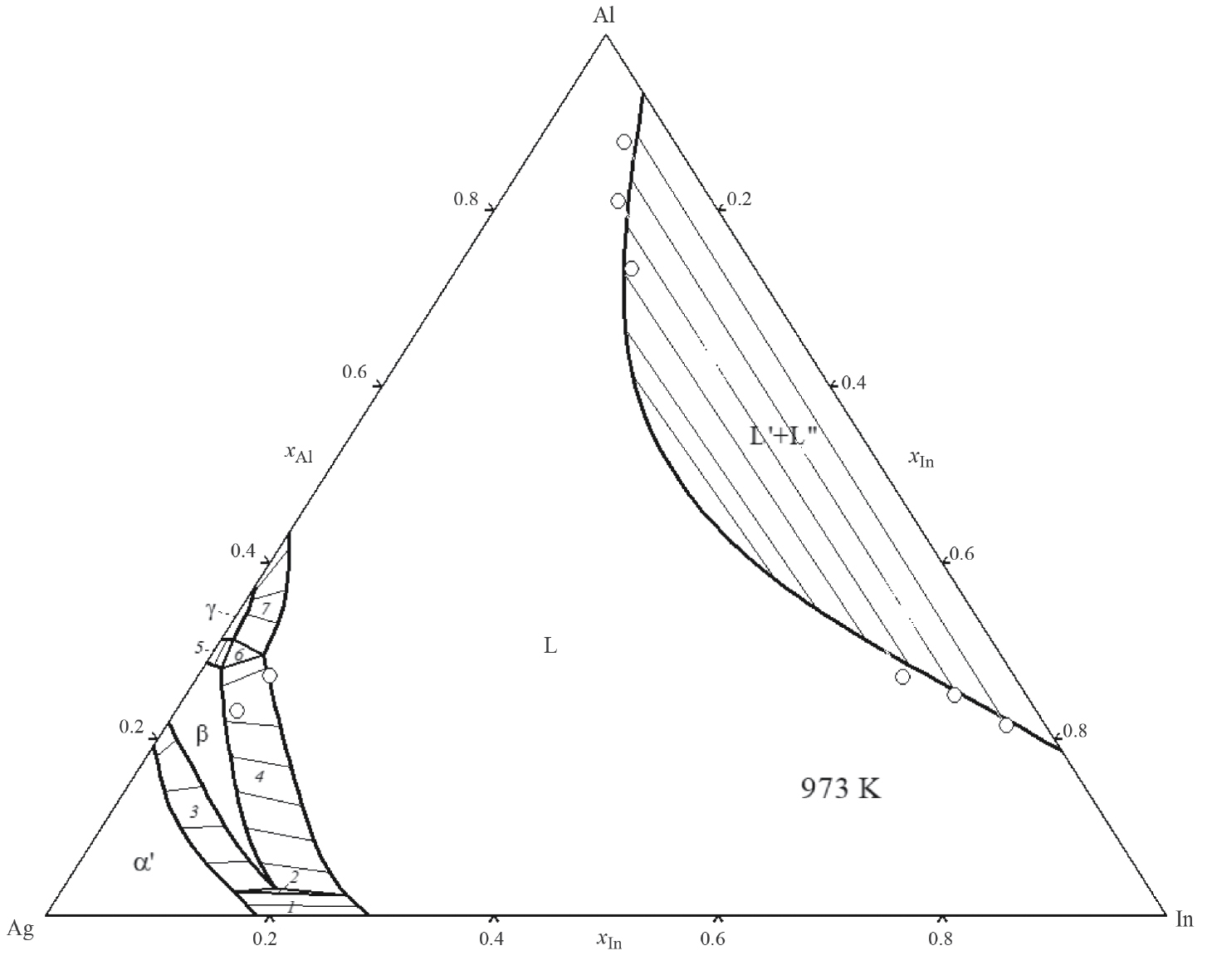 Рис. 8. Рассчитанное изотермическое сечение фазовой диаграммы системы Ag–Al–In при 973 К. Линии – расчет, точки – экспериментальные данные [4–7]; цифрами обозначены области сосуществования фаз: α' + L (1), α' + β + L (2), α' + β (3), β + L (4), β + γ (5), β + γ + L (6), γ + L (7).
