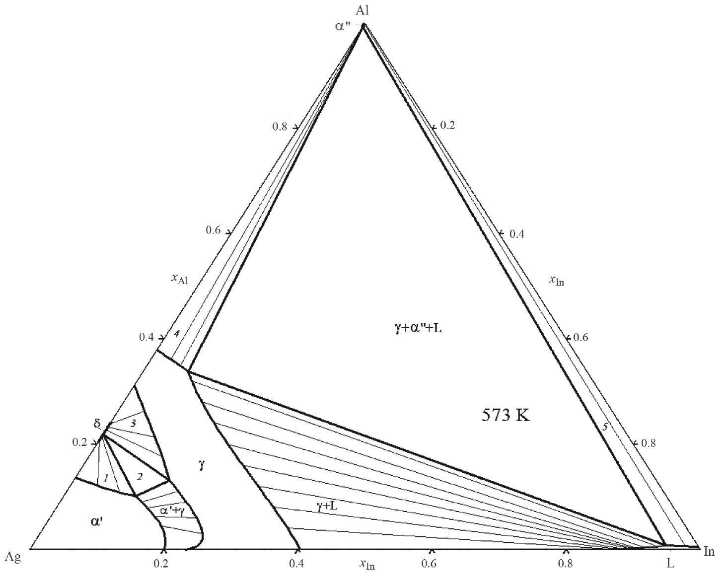 Рис. 9. Рассчитанное изотермическое сечение фазовой диаграммы системы Ag–Al–In при 573 К. Цифрами обозначены области сосуществования фаз: α' + δ (1), α' + γ + δ (2), γ + δ (3), γ + α" (4), In + α" (5).