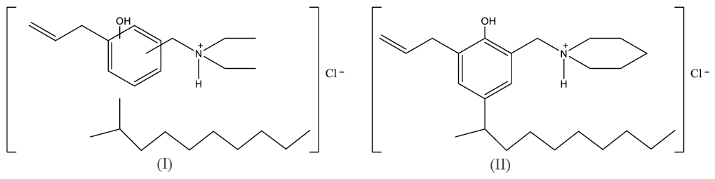Вышеуказанные соединения (I и II) были синтезированы тройной конденсацией 2-аллил-4-изодецилфенола с формальдегидом и аминами (диэтиламином и пиперидином соответственно) с последующей кватернизацией полученных оснований Манниха хлороводородом при комнатной температуре в течение 3–4 ч (выходы их составляют 97–98% от теоретических). Они представляют собой вязкие вещества светло-желтого цвета, хорошо растворимые в воде.