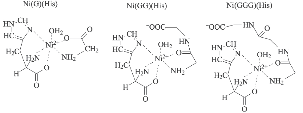 Ni2+ + GG– + His– ↔ Ni(GG)(His) | 11.74 ± 0.10 | 62.27 ± 0.23 | 67.01 ± 0.57 | 15.9 ± 0.8 |