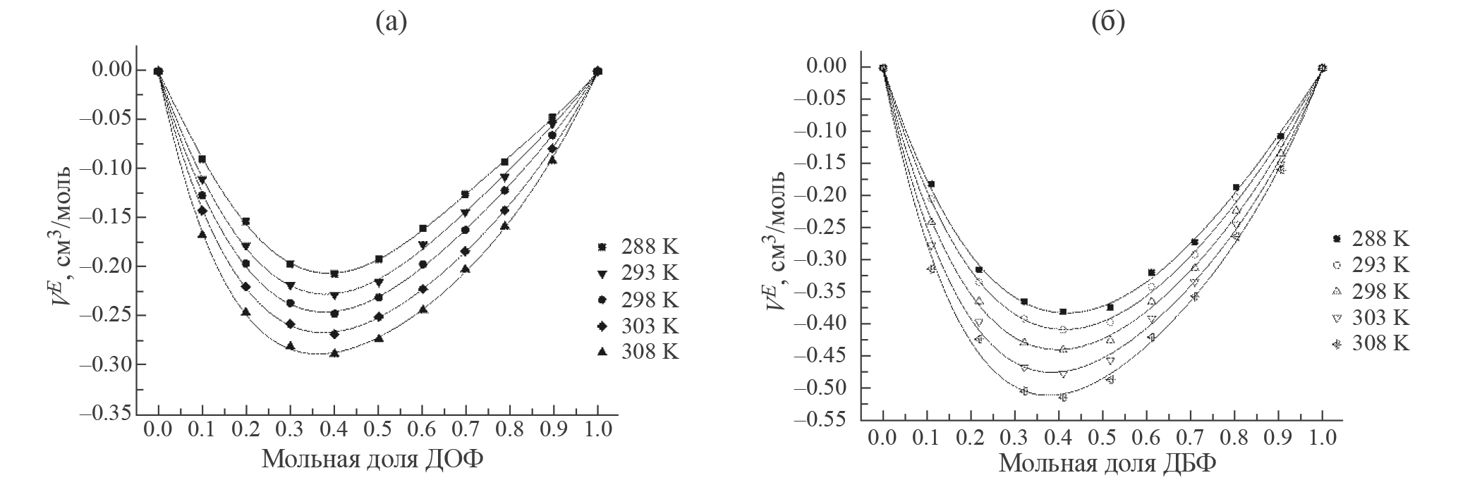 Бинарные смеси БА–ДБФ и БА–ДОФ демонстрируют отрицательные отклонения VE во всем диапазоне концентраций, сопровождающиеся увеличением отклонения от идеальности с повышением температуры. Минимальные значения VE находятся в диапазоне от 0.3 до 0.4 мольных долей ДБФ и ДОФ, причем можно отметить небольшое смещение положения минимума в сторону меньших концентраций с увеличением размера молекул фталата.