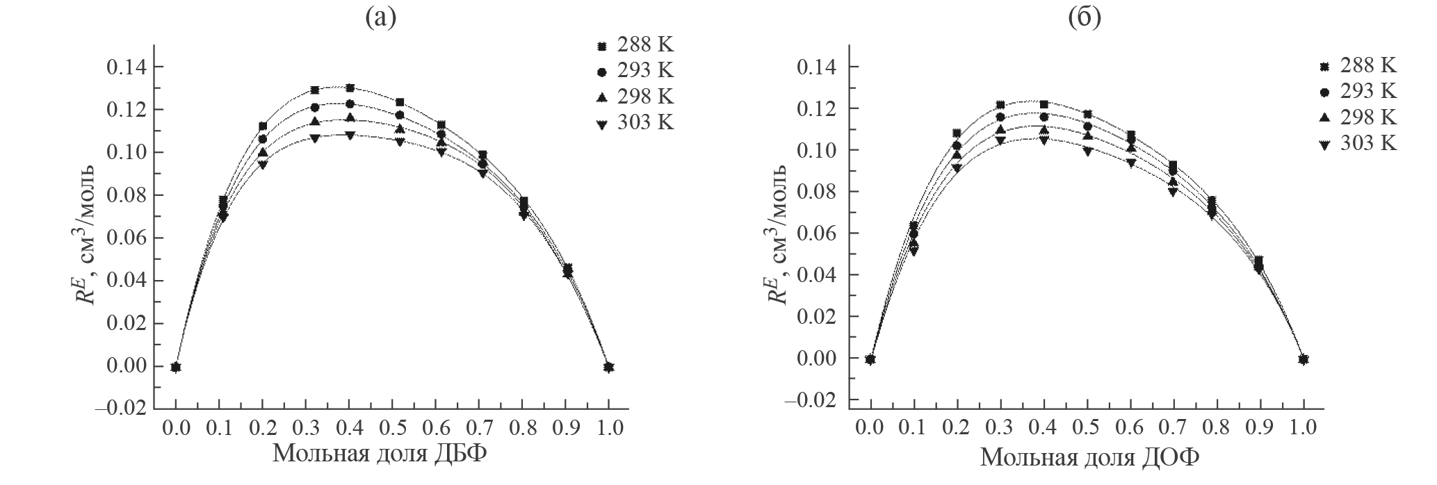 Рис. 3. Концентрационная зависимость избыточной молекулярной рефракции RE для смесей БА–ДБФ (а), БА–ДОФ (б).