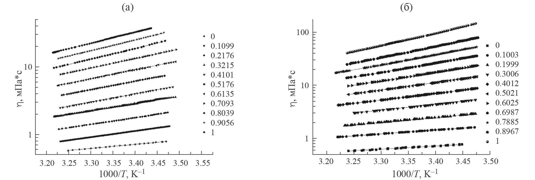 Рис. 4. Зависимости вязкости η от обратной температуры для смесей БА–ДБФ (а) и БА–ДОФ (б).