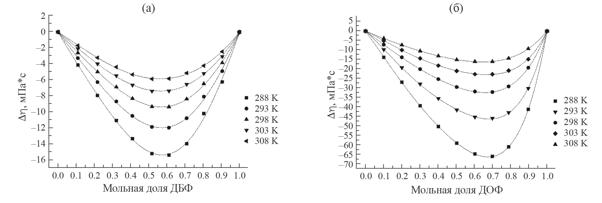 Таблица 6. Значения вязкости (мПа · с) систем БА–ДБФ и БФ–ДОФ в зависимости от мольной доли ДБФ и ДОФ в температурном диапазоне 288–308 K