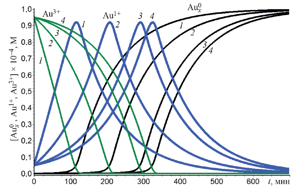 На рис. 3 представлены расчетные данные изменения концентрации Au3+, Au1+ и Aux0 при вариации “затравочной” концентрации Au1+. Видно, что чем выше концентрация “затравки”, тем быстрее процесс при существенном уменьшении периода индукции. Аналогичные результаты получены при вариации начальной (“затравочной”) концентрации Aux0.