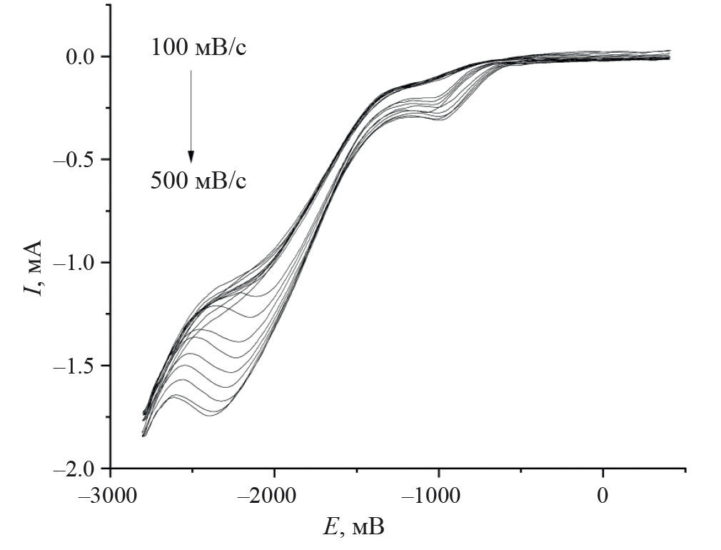 На рис. 1 приведены ЦВА, зарегистрированные для золотого электрода в растворе 3 в интервале потенциалов E от 400 мВ до ‒2800 мВ, при различных скоростях развертки потенциала ν от 100 до 500 мВ/с. На ЦВА наблюдаются два необратимых пика: первый, неявно выраженный в интервале потенциалов от ‒800 до ‒1150 мВ, и второй, в интервале потенциалов от ‒1500 до ‒2600 мВ.
