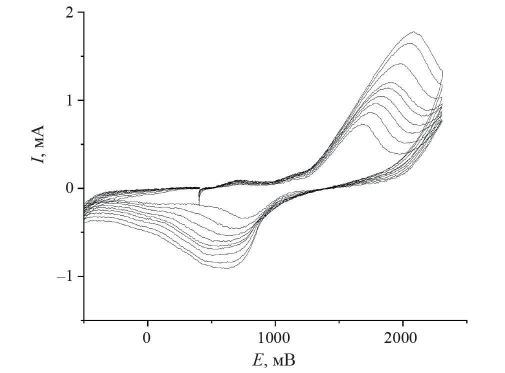 При регистрации ЦВА на золотом дисковом электроде с радиусом 4 мм в интервале потенциалов E от 400 до 2300 мВ были получены воспроизводимые ЦВА. Анодный пик был зафиксирован в интервале потенциалов от 1200 до 2300 мВ. При увеличении скорости развертки потенциала значение потенциала максимального значения тока смещалось в более анодную область. Также наблюдался квазиобратимый пик восстановления в катодной ветви развертки ЦВА (рис. 3).
