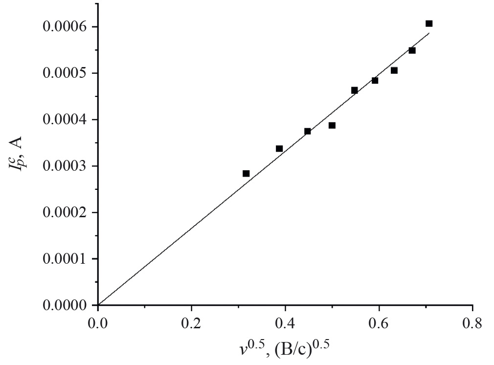 На рис. 2 изображены линейные зависимости Ip,c –ν0.5, проходящие через начала координат или близко к началу координат, что свидетельствует о том, что восстановление в обоих катодных процессах в исследуемых интервалах потенциалов лимитируется стадией диффузионного подвода субстрата к поверхности электрода [39, 40], поэтому в данном случае применимо уравнение