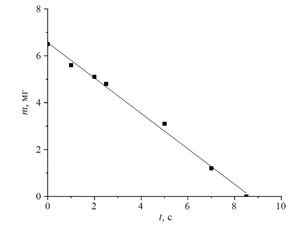 С целью изучения продуктов окисления проведен гравиметрический эксперимент, где в качестве анода использовался гладкий золотой электрод, а в качестве катода – платиновый (рис. 5). За все время эксперимента масса платинового катода увеличилась на 0.5 мг, при этом масса растворенного с анода золота составила 6.5 мг. При проведении электролиза с платиновым катодом наблюдается линейная зависимость растворения золота от времени эксперимента.