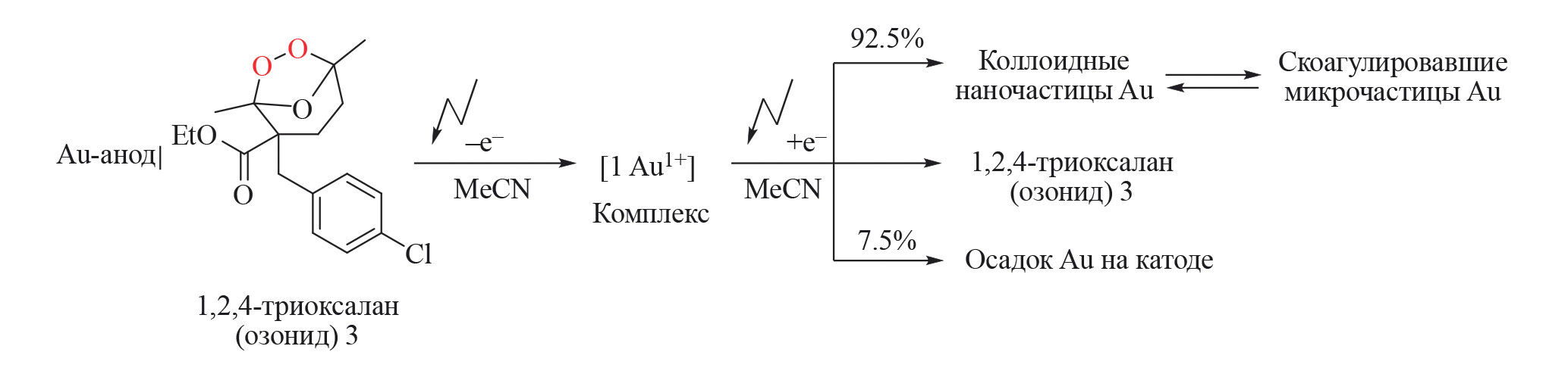 При изучении электрохимического поведения гладкого золотого электрода в растворе мостикового 1,2,4-триоксалана в ацетонитриле, было установлено, что в катодной области протекает восстановление пероксидной связи с переносом двух электронов с последующим разрывом цикла в соединении 3, вследствие чего образуется 1,5-дикетонный фрагмент. Гравиметрическим методом показано, что в анодном пространстве происходит коррозия золотого электрода с образованием наночастиц золота, причем перенос золотых частиц на катод практически не наблюдается.