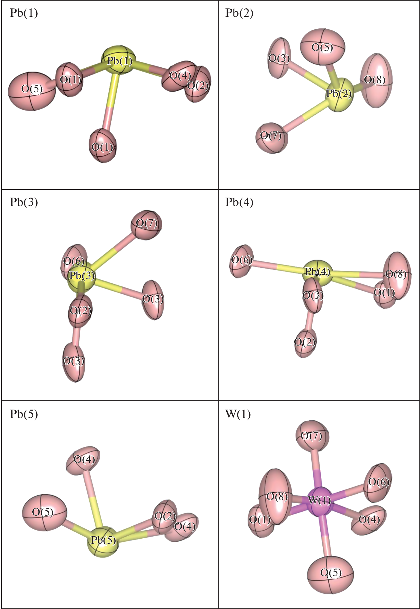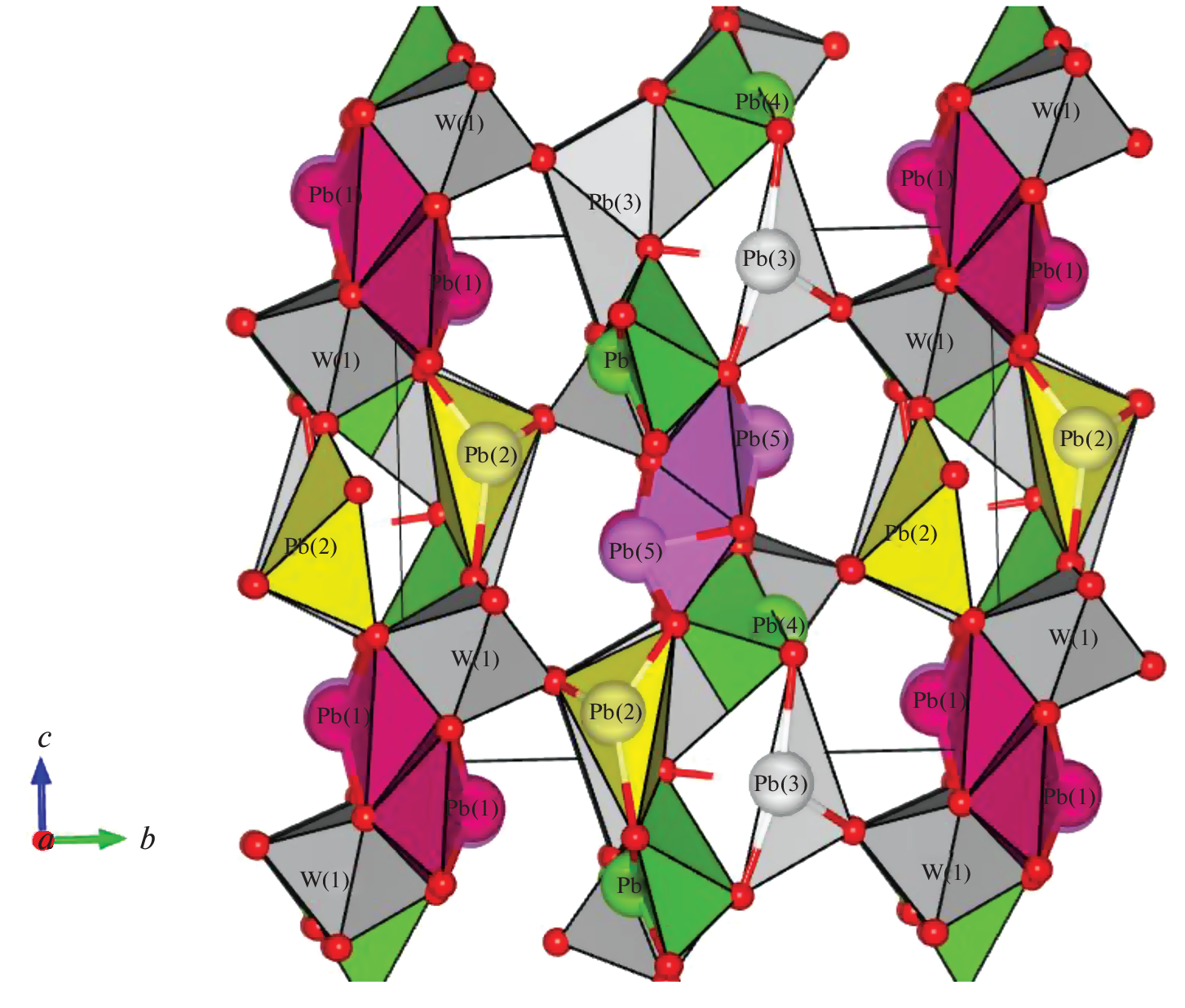 Single crystals of the Pb5WO8 phase were grown in the PbO–WO3 system by crystallization of (1 – x)PbO·xWO3 (x = 0.15–0.20) mixed melts. Thermogravimetric, X-ray diffraction, and dielectric studies of the single crystals were carried out. The phase melts at 712°С with decomposition to PbO and a liquid. The Pb5WO8 crystal structure is monoclinic (space group P21/n, 293 K) with the unit cell parameters a = 7.4430(1) Å, b = 12.1156(2) Å, c = 10.6284(2) Å, β = 90.658(1)°. The Pb5WO8 structure is retained at 100 K; the minor alterations in unit cell parameters are associated only with thermal expansion. The Pb5WO8 structure has a pronounced layered character; it appears as an alternation of layers formed of WO6 octahedra and strongly distorted PbO4 and PbO5 polyhedra in the direction [010]. A detailed crystal-chemical analysis of the structure was carried out. An important role of the Pb lone pair in the formation of characteristic voids in the structure was noted. The temperature-dependent dielectric permittivity and dielectric loss tangent feature relaxation peaks associated with lead and oxygen vacancies in the structure.