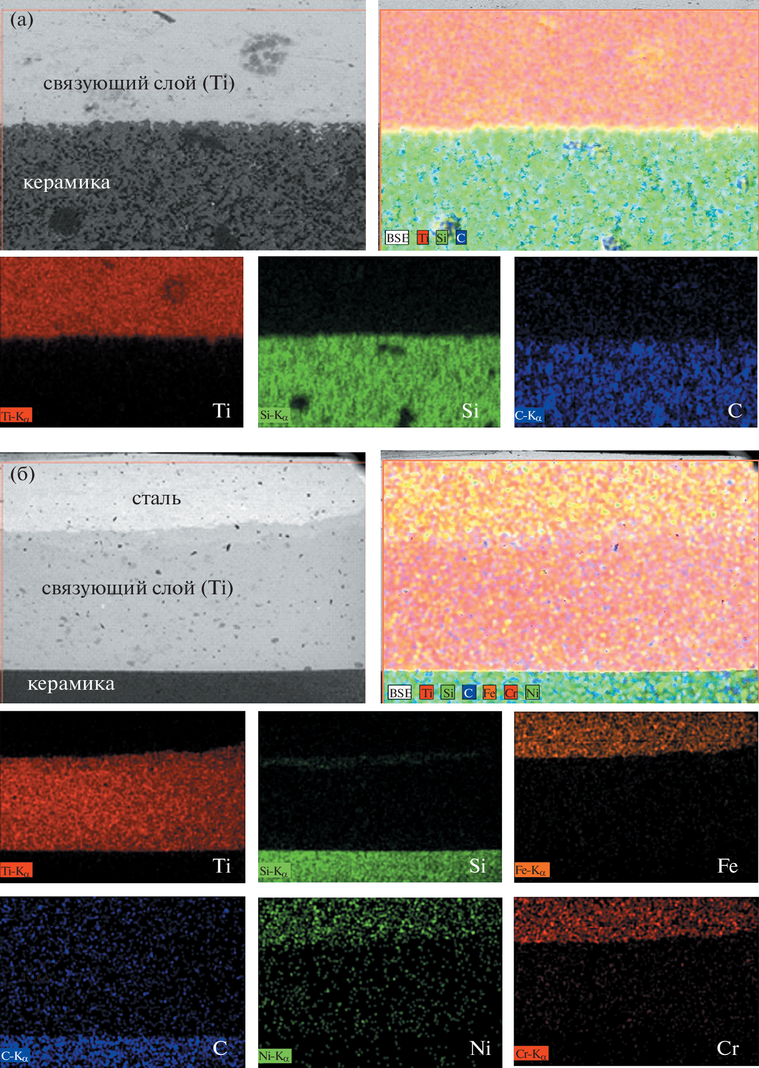 An important scientific task of practical materials science is the production of metal-ceramic composites in the form of functional gradient materials (FGM) for special-purpose products. In this regard, a study was conducted on the application of spark plasma sintering (IPS) technology for the effective diffusion connection of SiC ceramics and high-alloy steel (grade X18R15) to obtain a combined FGM composite. In a comprehensive experimental study, the dynamics of consolidation and changes in the phase composition of dispersed SiC under conditions of different temperatures and heating rates, pressing pressure, and holding time were studied. As a result, the IPS conditions were optimized for obtaining SiC ceramics of high relative density (>82%) and microhardness (>500 HV) of stable phase composition. The physicochemical foundations of the formation of a strong compound of a two-component SiC-ceramic and steel system under IPS conditions without additives and using a mixture of additives in the form of a binder, a reaction binder and a damper (Ti–Ag, Ti–TiH2, Ti–Ag–TiH2 and Ti–Ag/Mo additive systems) have been studied. The structure, composition of ceramics and intermediate (binding and damping) layers, as well as the diffusion of elements at the boundary of the formed compounds in FGM composites, were studied using XRF, SEM and EMF methods. It was found that the Ti–Ag/Mo additive in the ratio of 30 wt. % Ti–70 wt. % Ag and a dense layer of Mo (thickness ~ 2 mm), acting as a damper to compensate for the temperature coefficient of linear expansion, ensure the formation of a connected FGM composite of an integral shape. The presented studies have been implemented for the first time, are promising and require further development in order to gain scientific knowledge of the manufacture of composite products for special purposes.