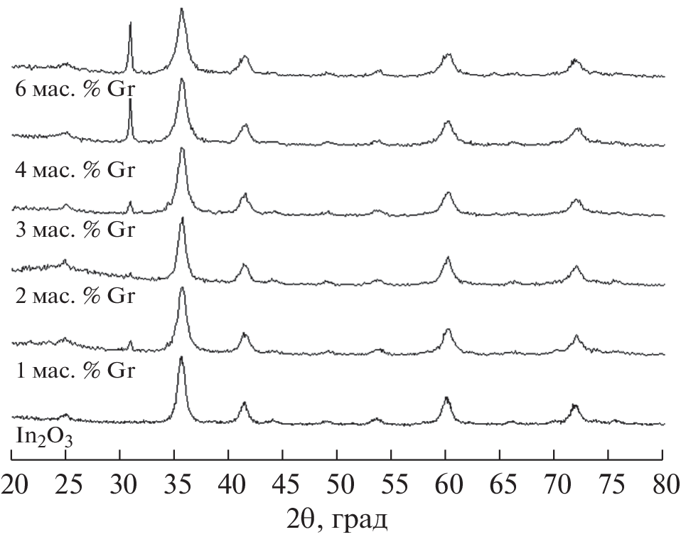 Indium oxide–graphene composites (containing 0–6.0 wt % graphene) were manufactured by the sol–gel process. The phase composition, microstructure, and gas-sensitive properties of the prepared materials were studied. The composites consist of isolated In2O3 and graphene phases, where graphene is predominantly adsorbed on the surfaces of indium oxide grains (the indium oxide grain sizes are 8–11 nm). The nanocomposites are distinguished by an enhanced sensitivity to both reducing gases (CH4, acetone) and oxidative gases (NO2). A far greater enhancement is in the sensory response to oxidative gases. Presumably, the major factors influencing the sensory properties of the composite are the high defectiveness of In2O3 and graphene phases, higher specific surface areas of composites compared to those of individual In2O3, and the likely formation of p–n junctions in the indium oxide and graphene contact zone. Graphene additives to indium oxide can improve the main performances (sensory response, response time, and recovery time) of single-electrode semiconductor sensors.