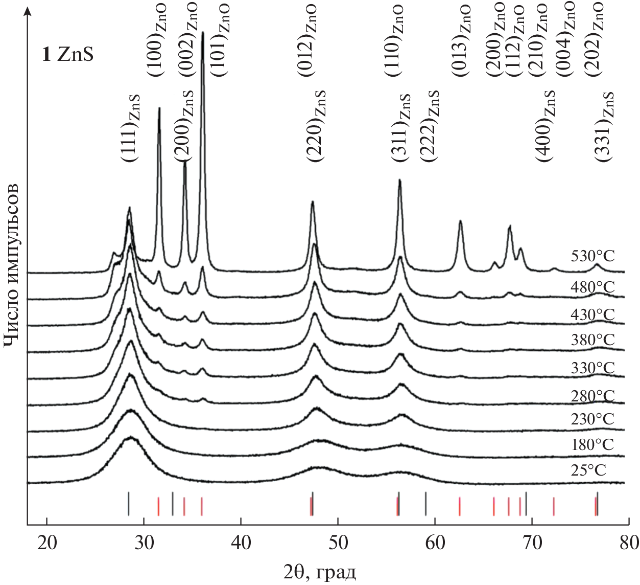 Nanocrystalline zinc sulfide (ZnS) powders are prepared via hydrothermal deposition from aqueous solutions of zinc nitrate and sodium sulfide in the presence of sodium citrate or Trilon B. The average particle sizes of the product ZnS nanopowders ranging from 2 to 9 nm are tuned via varying the batch concentrations of the reagents. Air-annealing of as-prepared ZnS nanopowders at temperatures of 280 to 530°C oxidizes cubic zinc sulfide to hexagonal zinc oxide. The oxidation of the finest-grained zinc sulfide nanopowders having a particle size of 2 nm starts at 280–330°C, while the coarsest-grained nanopowder having a particle size of 9 nm starts to oxidize at 530°C. In the coarsest-grained ZnS powder, the particle size increases as little as from 9 to 12 nm when temperature rises to 530°C, while the finest-grained nanopowders have their particle sizes increase from 2 to 9 nm in response to the same rise in temperature.