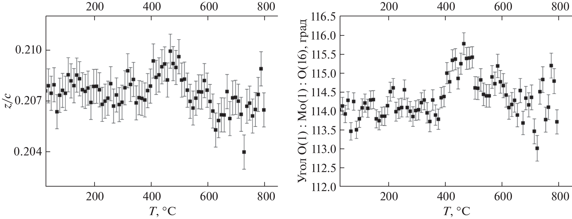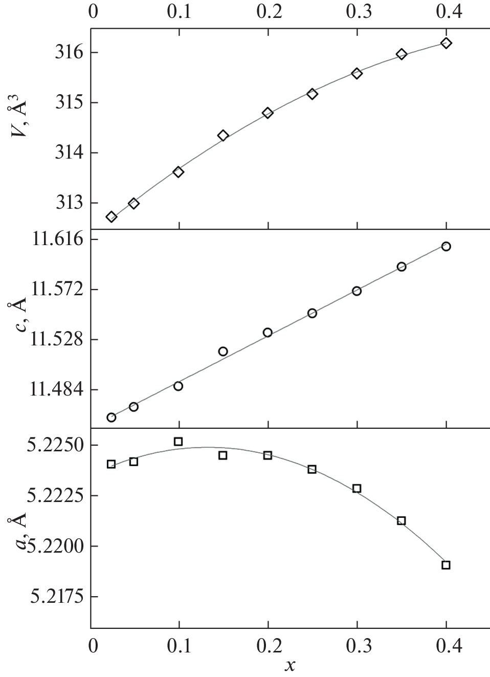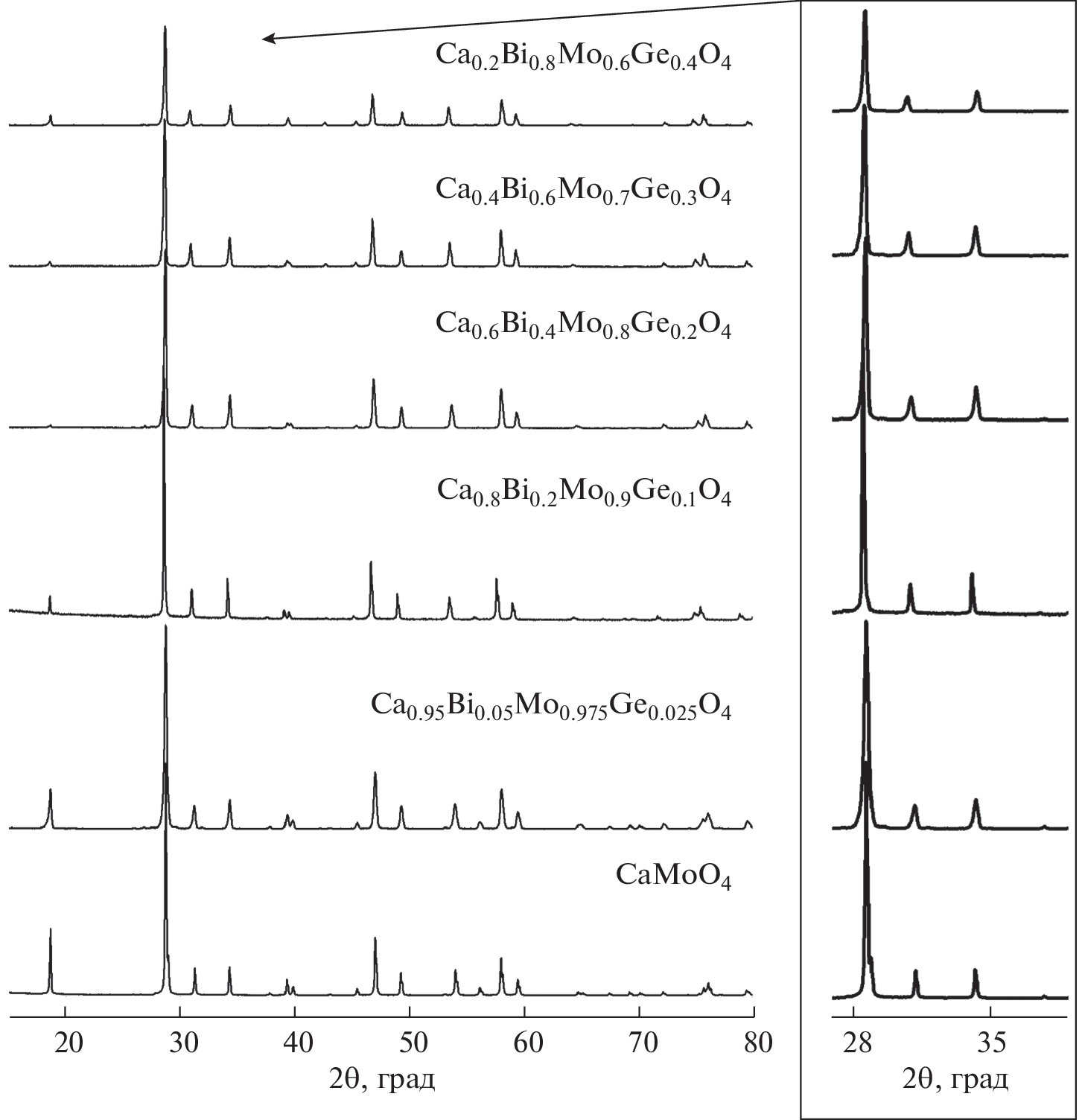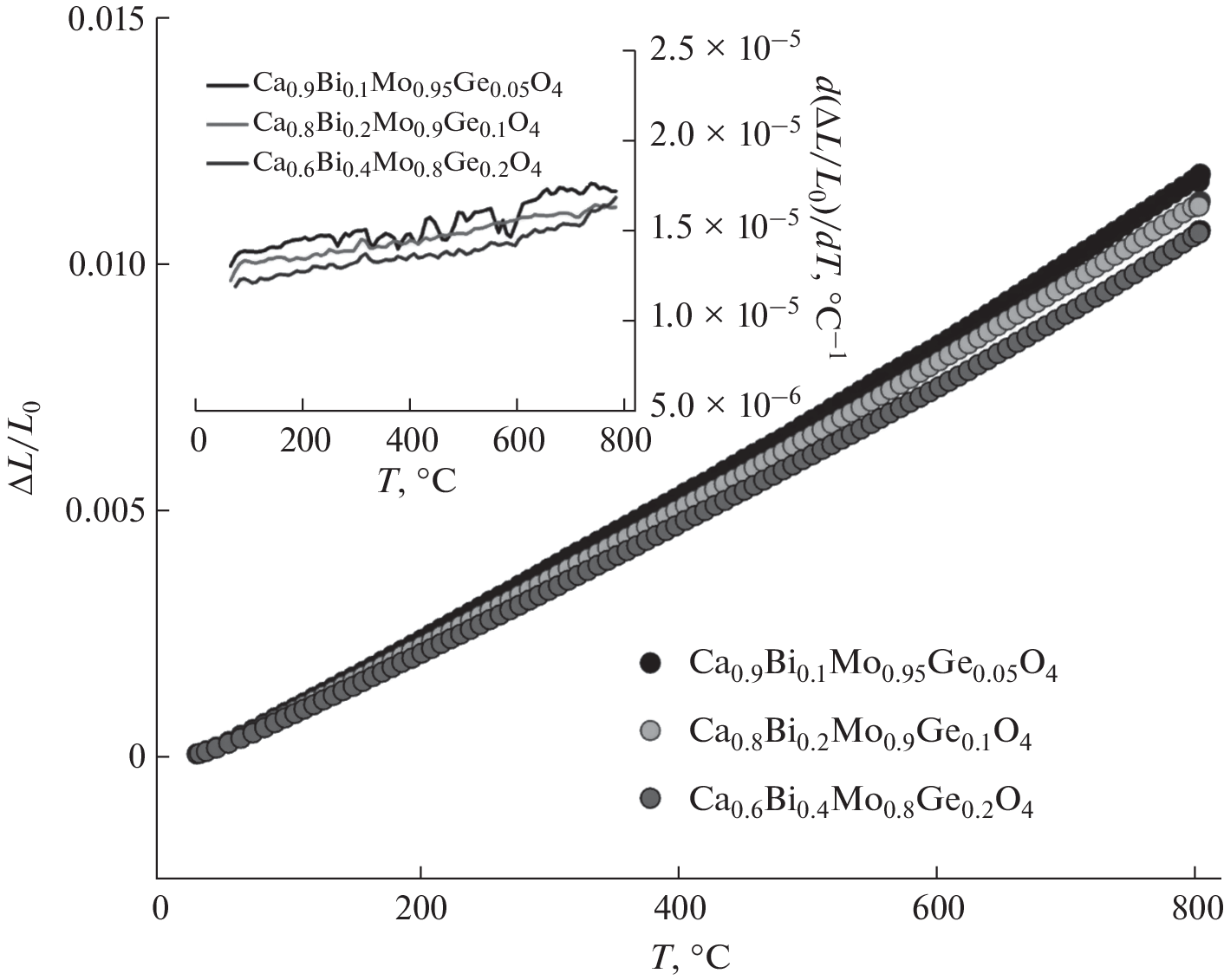 По стандартной керамической технологии получены твердые растворы Ca1 – 2xBi2xMo1 – xGexO4 с шеелитоподобной структурой (пр. гр. I41/a) и областью гомогенности х = 0.0–0.4. С ростом концентрации допантов происходит рост параметра с и объема элементарной ячейки, обусловленный изменением размера полиэдров Ca/BiO8. На основании анализа температурных функций параметров элементарной ячейки и вида спектров комбинационного рассеяния показано преимущественно тепловое расширение полиэдров Ca/BiO8. Рассчитаны длины связей Ca/Bi–O и Mo/Ge–O. Увеличение концентрации допантов приводит к уменьшению коэффициента термического расширения керамических образцов, увеличению значений электропроводности и энергии активации сложных оксидов по сравнению с матричным соединением. Определен эффективный коэффициент диффузии кислорода.