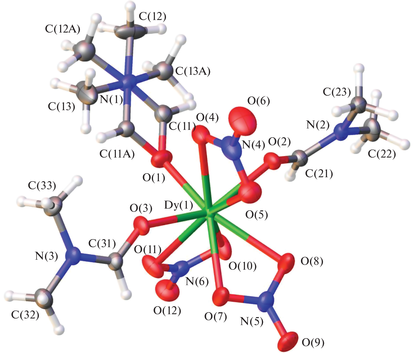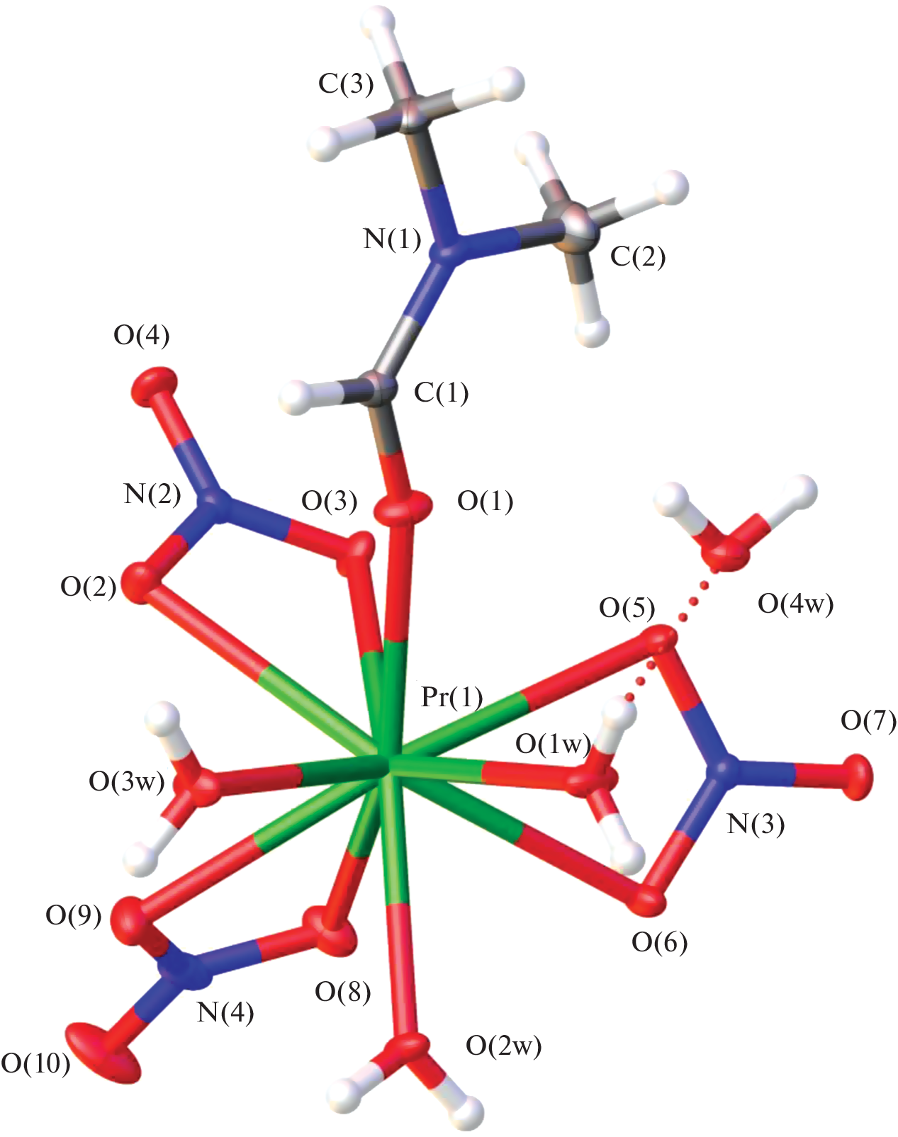 In the rare-earth element nitrate (REE)–dimethylformamide (DMF)–water systems, which can be used to obtain nanosized REE oxides by solution combustion synthesis (SCS), the formation of coordination compounds [M(H2O)3(DMF)(NO3)3]·H2O (M = La–Pr) and [M(DMF)3(NO3)3] (M = Sm–Lu, Y) has been found. Using physicochemical methods of analysis (IR spectroscopy, X-ray powder diffraction, single-crystal X-ray diffraction, elemental analysis, thermogravimetric analysis, and differential scanning calorimetry), their composition has been determined and structural features have been established; thermolysis processes have been studied in a wide temperature range. It is shown that the final products of the decomposition of complex compounds are oxides of rare earth elements.