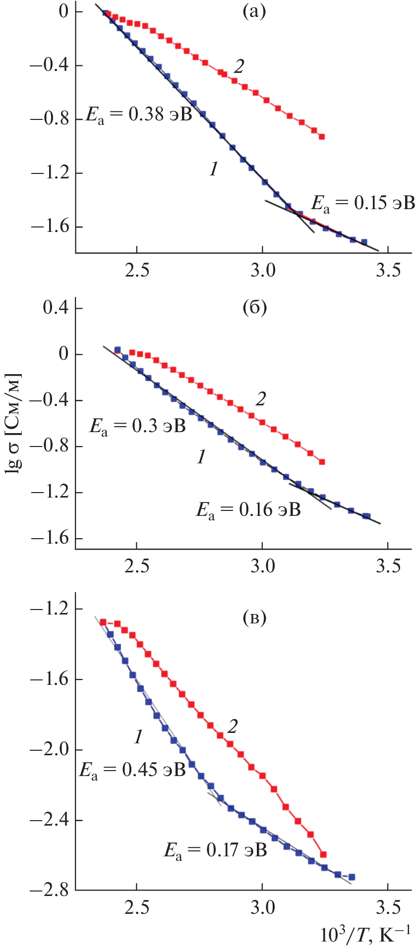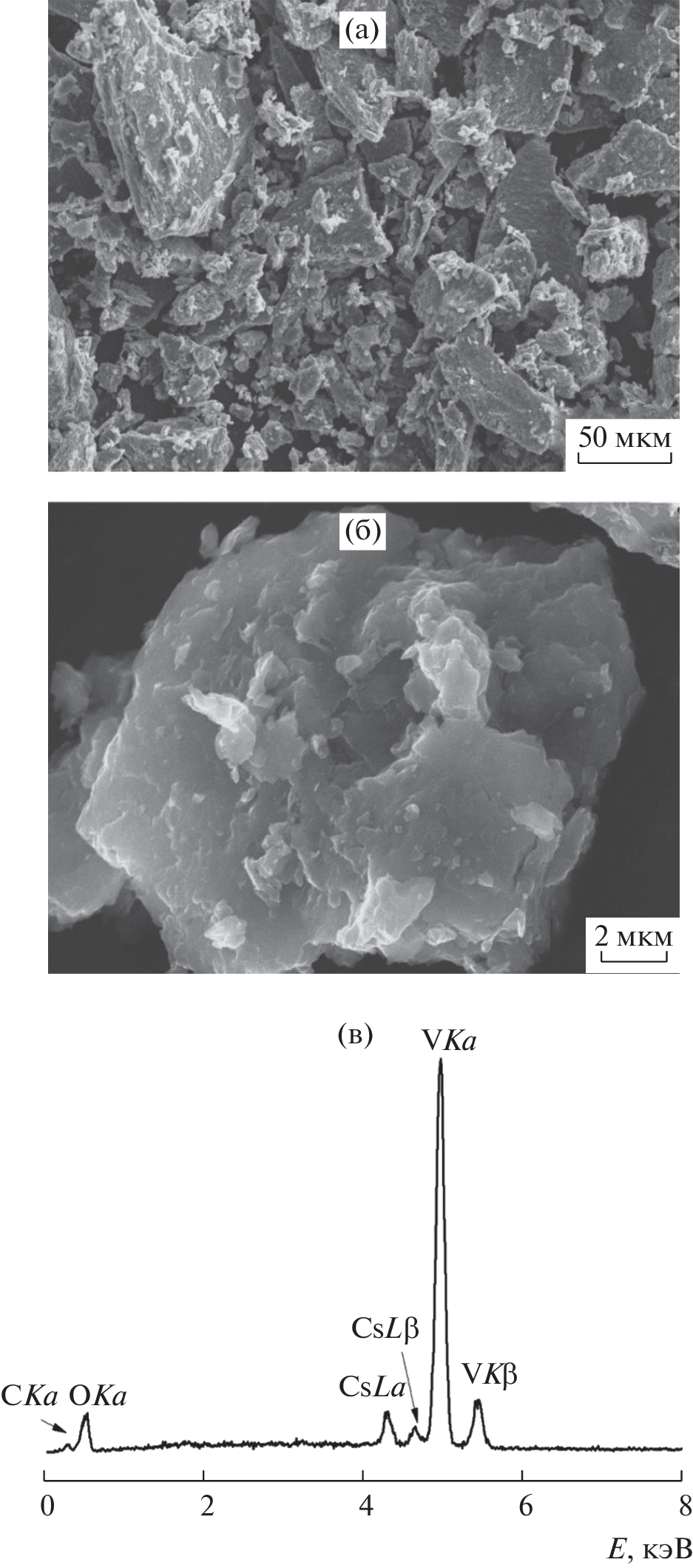 Cesium-containing compounds of hydrated vanadium(V) oxide of general formula СsxV2O5·nH2O, where 0.1 ≤ x ≤ 0.6 and 0.8 ≤ n ≤ 1.2, were prepared by hydrothermal, hydrolytic, and sol–gel processes. The preparation conditions were found to determine the intercalated cation (Cs+) homogeneity range and the vanadium(IV) percentage in the samples. The prepared compounds were characterized by a set of physicochemical methods, namely, IR spectroscopy, X-ray powder diffraction, thermogravimetric analysis, scanning electron microscopy, and low-temperature nitrogen adsorption. The СsxV2O5·nH2O compounds prepared by the hydrolytic and hydrothermal methods had the highest specific surface area, equal to 34.0 and 16.5 m2/g, respectively. The temperature-dependent electrical conductivities of СsxV2O5·nH2O samples were measured to estimate the activation energy of conduction in compounds having various vanadium(IV) percentages. It is only in the high-temperature range that the activation energy of conduction depended on the V4+ percentage in the sample; the least value was found in the hydrothermally prepared Сs0.6V2O5·H2O samples.