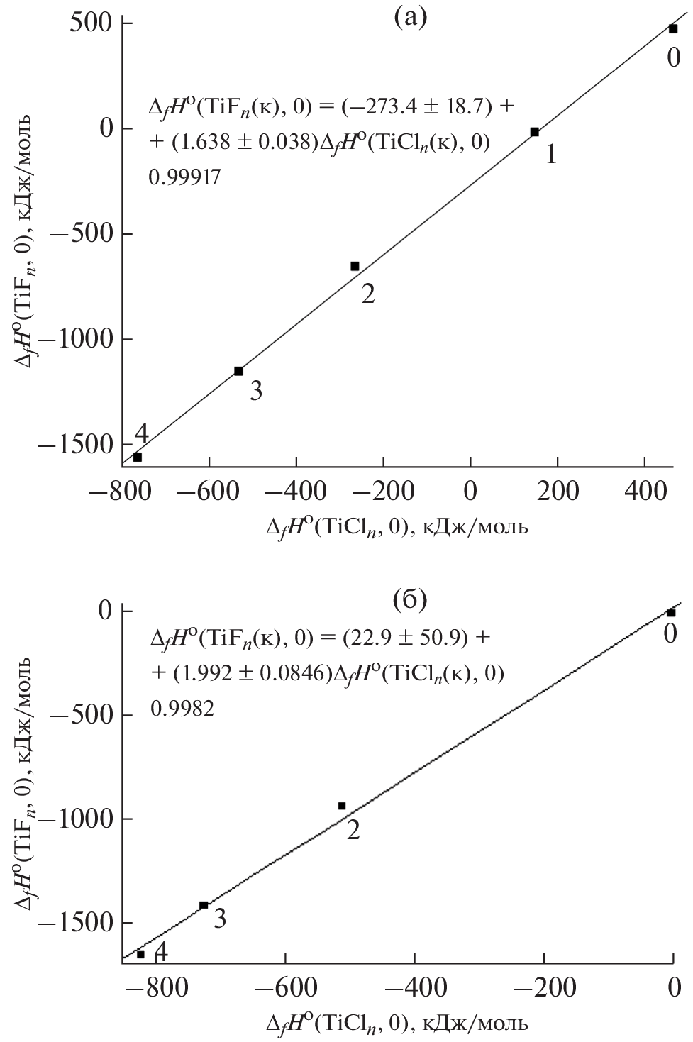 New values for the standard enthalpies of formation of titanium fluorides at 0 K have been obtained by revisiting data on homogeneous and heterogeneous equilibria with their participation (kJ/mol): –1403.2 ± 2.7 for TiF3(c), –1144.2 ± 3.3 for TiF3, –2349.4 ± 6.3 for Ti2F5(c); –933.7 ± 6.8 for TiF2(c), and –650.4 ± 2.4 TiF2. The thermodynamic metastability of TiF2(c) has been shown.