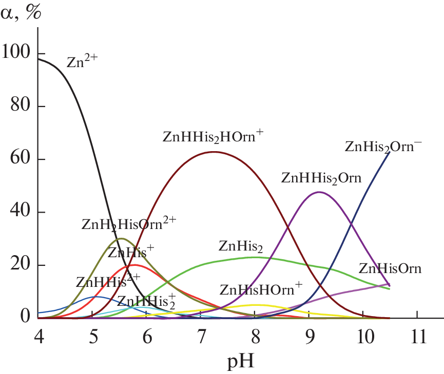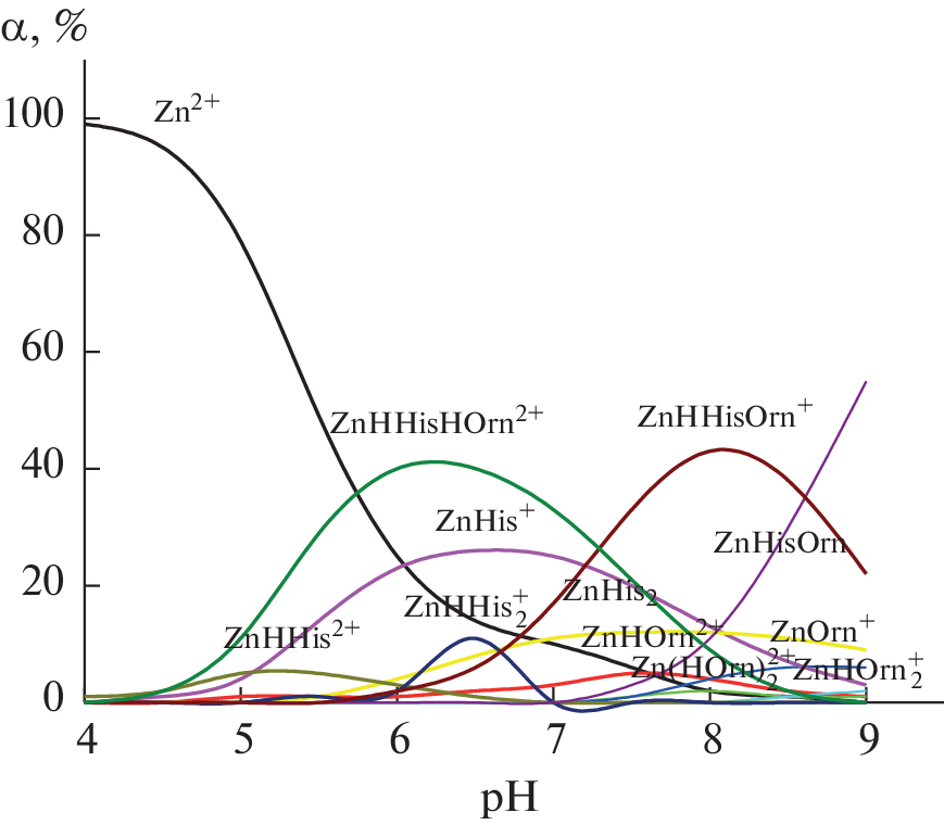 The formation of mixed-ligand complexes of various compositions in the Zn–L-histidine (His)–L-ornithine (Orn) system has been studied by pH-metry, calorimetry, and NMR spectroscopy. The thermodynamic parameters (log K, ΔrG0 ΔrH, ΔrS) of the reactions of their formation at 298.15 K and ionic strength I = 0.5 (KNO3) have been calculated. Based on the comparative analysis of thermodynamic parameters, the most probable method for the coordination of amino acid residues in mixed complexes has been proposed.