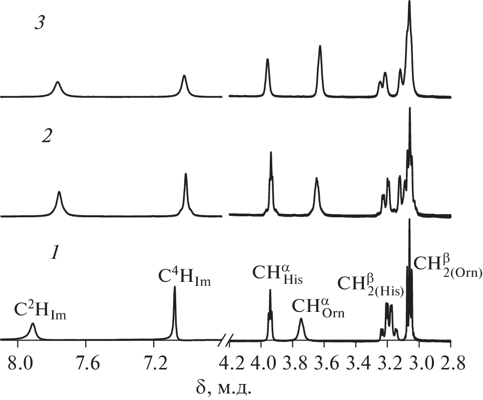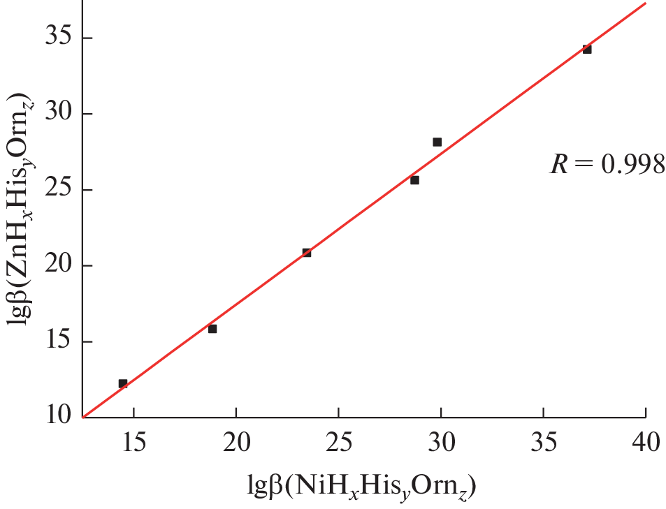 Методами pH-метрии, калориметрии и ЯМР-спектроскопии изучено образование смешанолигандных комплексов различного состава в системе Zn–L-гистидин (His)–L-орнитин (Orn). Рассчитаны термодинамические параметры (lg K, ΔrG0 ΔrH, ΔrS) реакций их образования при 298.15 K и ионной силе I = 0.5 (KNO3). На основании проведенного сравнительного анализа термодинамических параметров предложен наиболее вероятный способ координации аминокислотных остатков в составе смешанных комплексов.