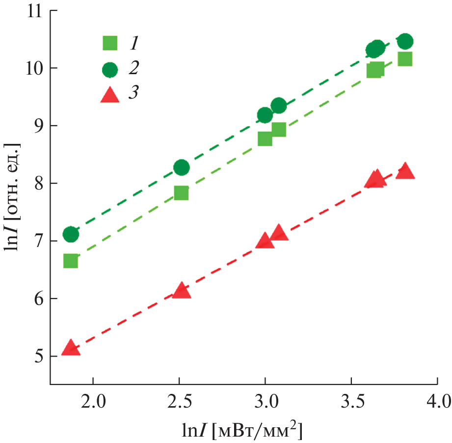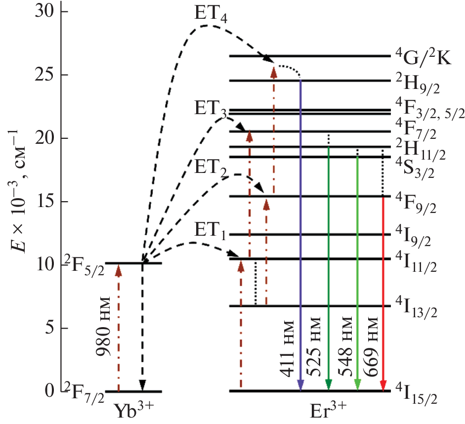 Trigonal solid solutions Na5Rb7Sc1.95Yb0.05 – xErx(WO4)9 (x = 0.0025–0.0375) and Na5Rb7Sc2 – 5y-Yb2yEr3y(WO4)9 (y = 0.005–0.015) based on ternary tungstate Na5Rb7Sc2(WO4)9 have been obtained by ceramic technology and their luminescence properties have been studied. Excitation of powders by infrared radiation of the laser module (λex = 980 nm, Pmax = 45 mW/mm2) leads to the appearance of a bright green emission. The highest intensity of the bands at 515–540 nm (2H11/2 → 4I15/2), 540–575 nm (4S3/2 → 4I15/2), and 645–680 nm (4F9/2 → 4I15/2) is observed for sample Na5Rb7Sc1.95Yb0.02Er0.03(WO4)9. For a given composition, the power and temperature dependences of optical characteristics have been studied, a mechanism for energy transfer between optical centers has been proposed, and chromaticity coordinates have been determined. Based on the data obtained, it has been concluded that Na5Rb7Sc1.95Yb0.02Er0.03(WO4)9 can be used as a material for non-contact luminescent thermometry.