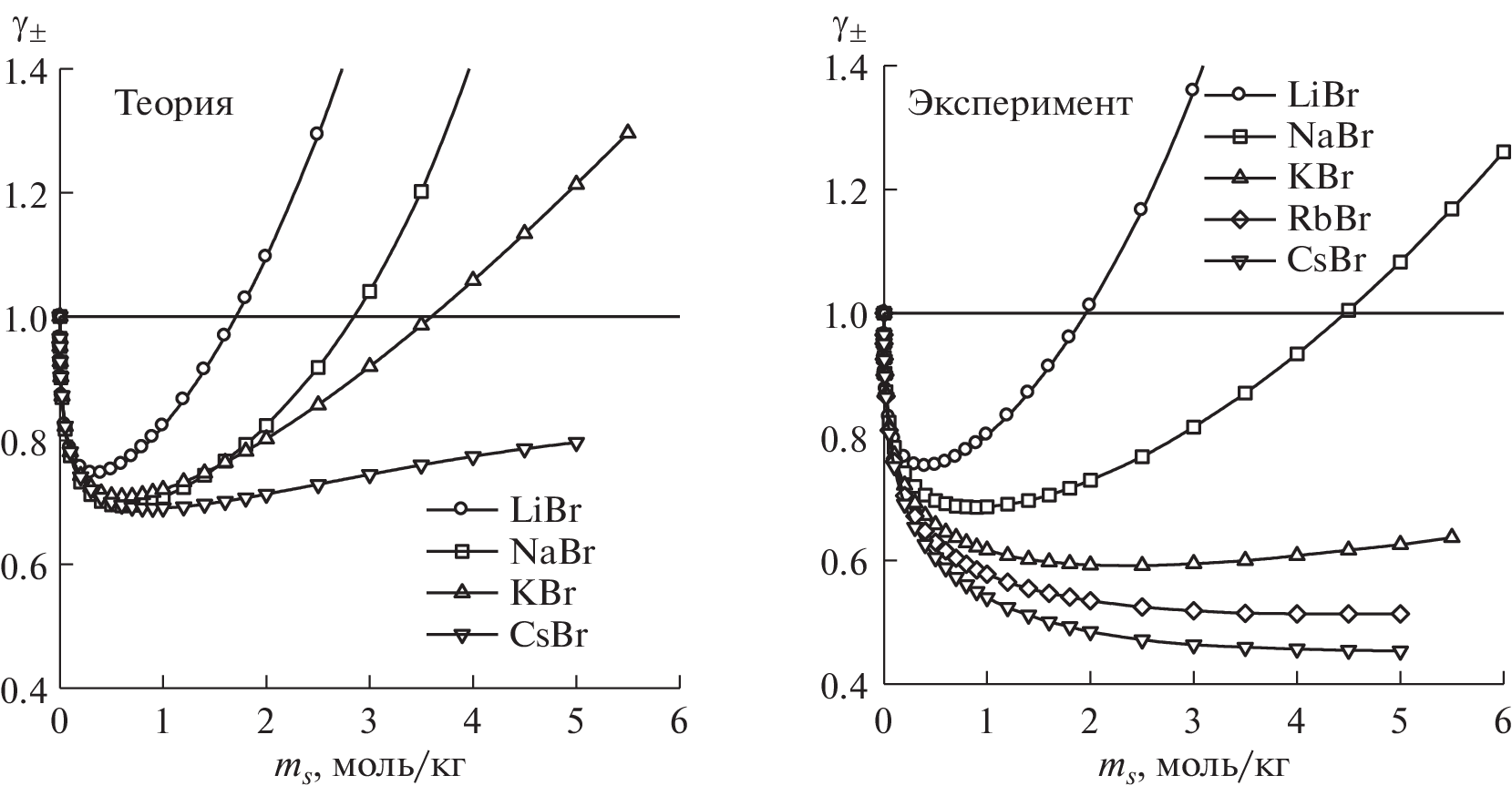 Extended Debye–Hückel (EDH) theory was used to calculate activity coefficients in aqueous solutions of alkali-metal bromides at 298 K from experimentally determined values of their static permittivities. Calculations with non-optimized model parameters fit the nonmonotonic concentration-dependent trend of the activity coefficients and the cation radius–dependent trend of the activity coefficients. The latter is explained by hydration weakening and ion association strengthening in response to increasing cation radius in the salt series.