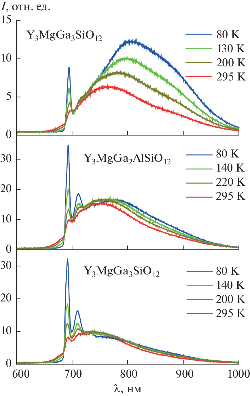 Методом высокотемпературного твердофазного синтеза получены керамические образцы многокомпонентных гранатов Y3MgGa3SiO12, Y3MgGa2AlSiO12 и Y3MgGaAl2SiO12, легированных 0.2 ат. % Cr3+. В спектрах люминесценции синтезированных образцов гранатов зарегистрированы перекрывающиеся между собой широкополосная люминесценция в дальней красной области спектра, обусловленная переходом 4T2 → 4A2 в ионах Cr3+, и узкая полоса в интервале 690–700 нм, соответствующая бесфононной линии перехода 2Е → 4A2 в Cr3+. Узкополосная и широкополосная части спектров отнесены к излучениям от двух разных типов хромовых центров, находящихся в октаэдрической координации с различной степенью искажения и силы кристаллического поля, обусловленных наличием на октаэдрической позиции данных гранатов двух ионов, существенно различающихся по кристаллохимическим свойствам, а именно Mg2+ и Ga3+ (Al3+). Исследованные люминофоры, обладающие широкополосной люминесценцией в фитоактивной дальней красной области спектра, имеют потенциал для использования в тепличных светодиодных светильниках.