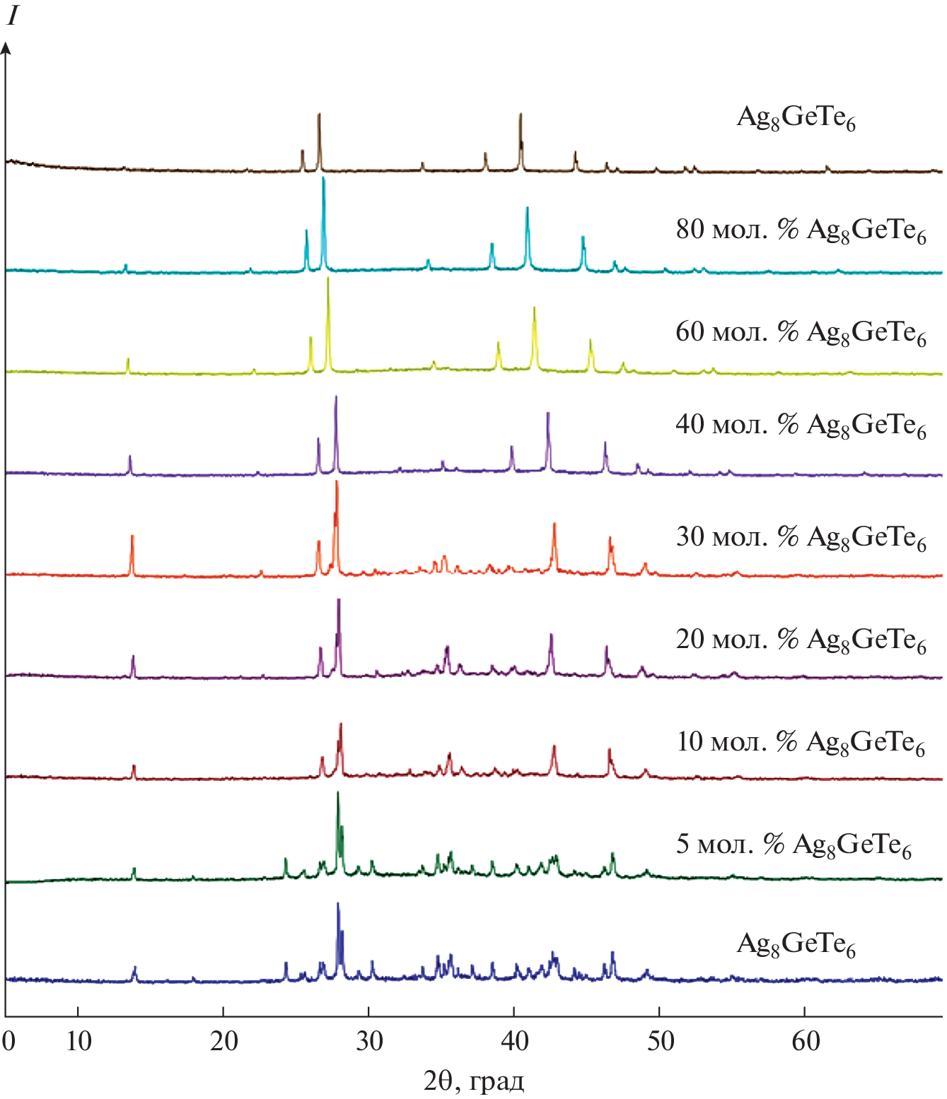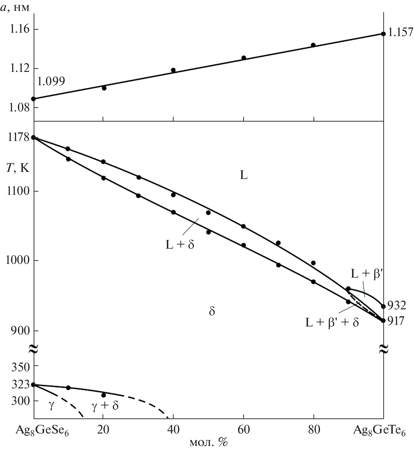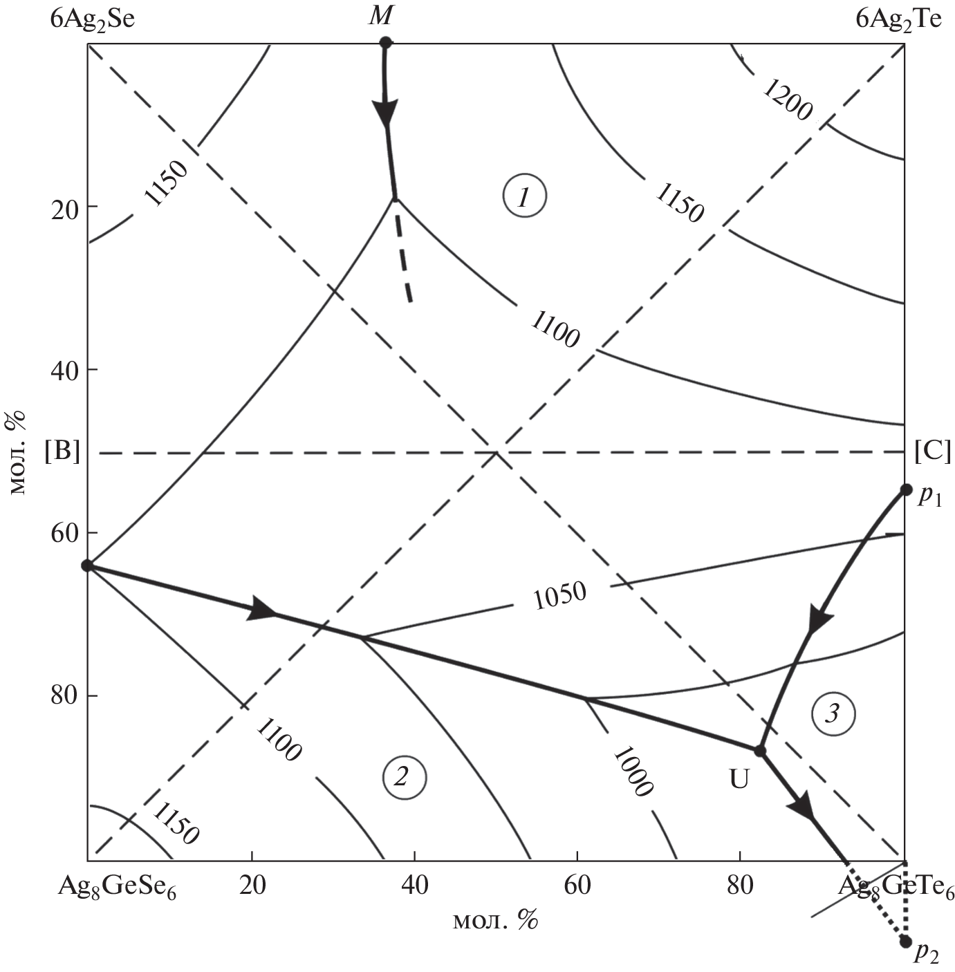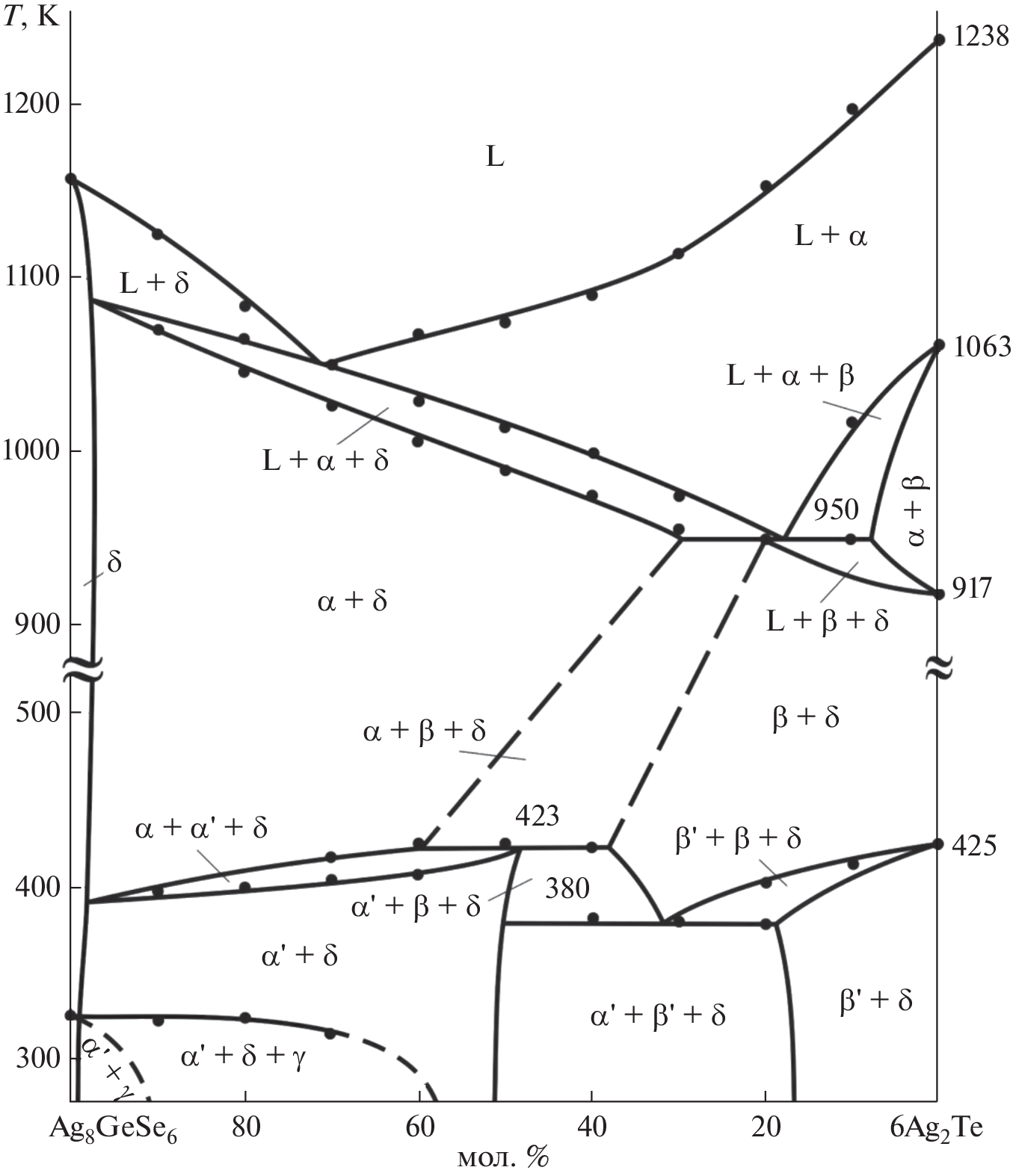 Представлены результаты исследования фазовых равновесий во взаимной системе 6Ag2Se + + Ag8GeTe6 ↔ 6Ag2Te + Ag8GeSe6 (А) методами ДТА и РФА. Построены Т–х-диаграмма граничной системы Ag8GeSe6–Ag8GeTe6, ряд внутренних политермических сечений, изотермические сечения при 300 и 1000 K фазовой диаграммы, а также проекция поверхности ликвидуса. Cистема Ag8GeSe6–Ag8GeTe6 является частично квазибинарной и характеризуется образованием непрерывного ряда твердых растворов замещения между Ag8GeTe6 и высокотемпературной кубической модификацией Ag8GeSe6 (δ-фаза). При образовании твердых растворов температура полиморфного перехода Ag8GeSe6 понижается, что приводит к стабилизации ионопроводящей кубической фазы в области составов ≥40 мол. % Ag8GeTe6 при комнатной температуре и ниже. Показано, что система А является обратимо-взаимной, поверхность ликвидуса состоит из трех полей, отвечающих первичной кристаллизации твердых растворов между высокотемпературными модификациями Ag2Se и Ag2Te (α-фаза), твердых растворов на основе IT-Ag2Te (β-фаза) и δ-фазы. В субсолидусной части системы А наблюдается сложное взаимодействие, связанное с полиморфизмом исходных соединений и фаз на их основе.