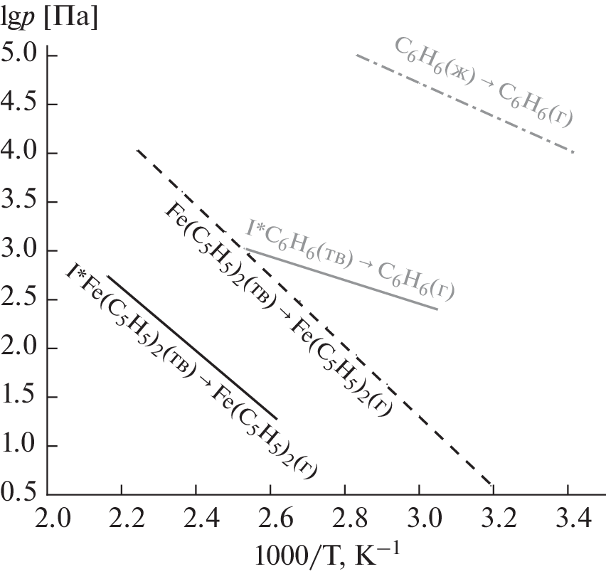 The pressure of ferrocene in the system host (organometallic framework [Zn4(dmf)(ur)2(ndc)4])–guest (ferrocene) has been measured by static method with membrane zero-manometers in the temperature range from 324 to 462 K. As a result of the study, temperature dependences of pressure have been obtained for the transition of the guest from the host framework to the gas phase, the enthalpy and entropy of this process have been determined, and the change in the Gibbs energy during ferrocene binding by the framework has been calculated. Based on this information, conclusions have been made about the nature of interactions between host and guest molecules, and the obtained results have been compared with the previously studied benzene sorption on [Zn4(dmf)(ur)2(ndc)4].