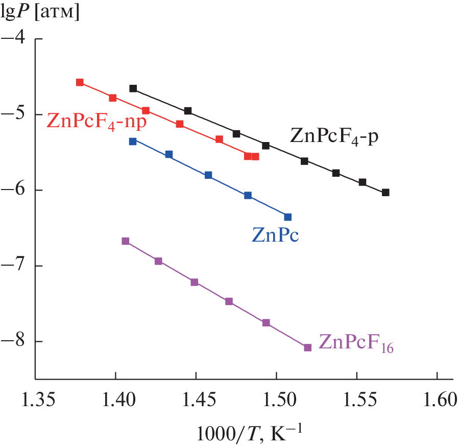 This work is devoted to the study of the effect of the position of fluorine substituents in the molecules of tetrafluorosubstituted zinc phthalocyanines on their saturated vapor pressure. For this purpose, the temperature dependence of the saturated vapor pressure of zinc phthalocyanines with fluorine substituents in the peripheral (ZnPcF4-p) and non-peripheral (ZnPcF4-np) positions of the phthalocyanine ring has been studied by the Knudsen method with mass spectrometric recording of the composition of the gas phase and the thermodynamic parameters of vaporization were calculated. The data obtained for ZnPcF4-p and ZnPcF4-np with unsubstituted and hexadecafluorosubstituted zinc phthalocyanines are compared in terms of analysis of intermolecular interactions in the crystals of these compounds. It has been shown that tetrafluorosubstituted phthalocyanines have a higher vapor pressure than their unsubstituted (ZnPc) and hexadecafluorosubstituted (ZnPcF16) derivatives. In this case, the enthalpy of sublimation increases in the series ZnPcF4-p < ZnPcF4-np < ZnPc < ZnPcF16.