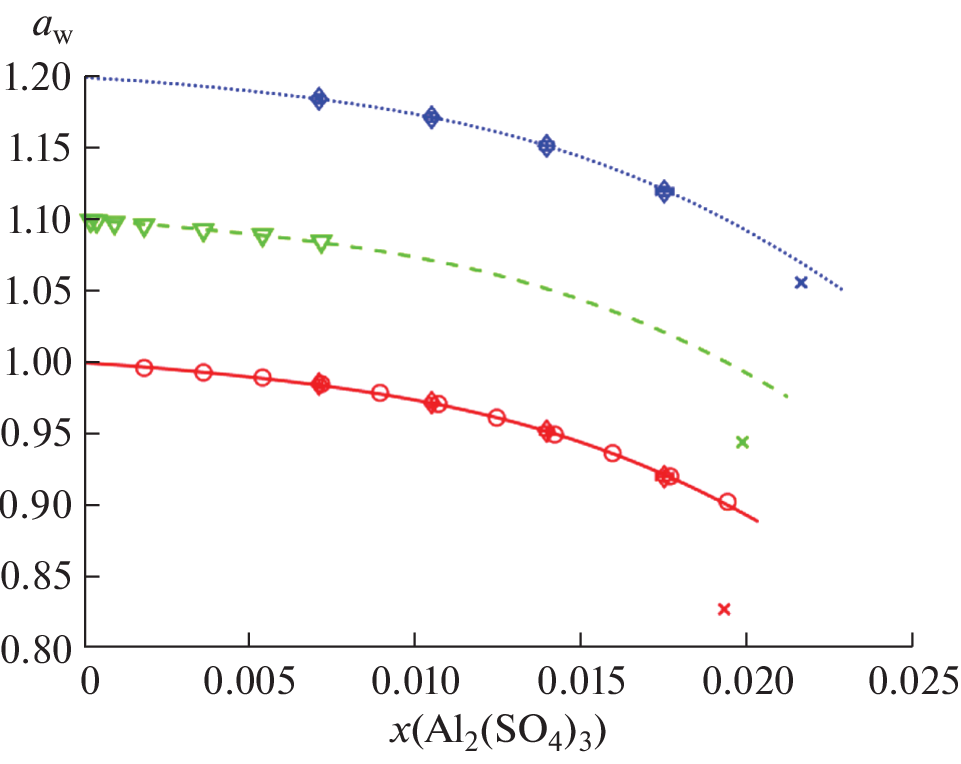 The vapor pressure in the H2O–Na2SO4–Al2(SO4)3 system at 15, 25, and 35°C was measured by a static method. The vapor pressure in the H2O–Al2(SO4)3 and H2O–Na2SO4–Al2(SO4)3 systems at 25 and 50°C was measured by the dew point method. A set of parameters of the Pitzer–Simonson–Clegg (PSC) model was determined to describe adequately vapor– liquid equilibria in the H2O–Al2(SO4)3 and H2O–Na2SO4–Al2(SO4)3 systems in the temperature range from 15 to 50°С.