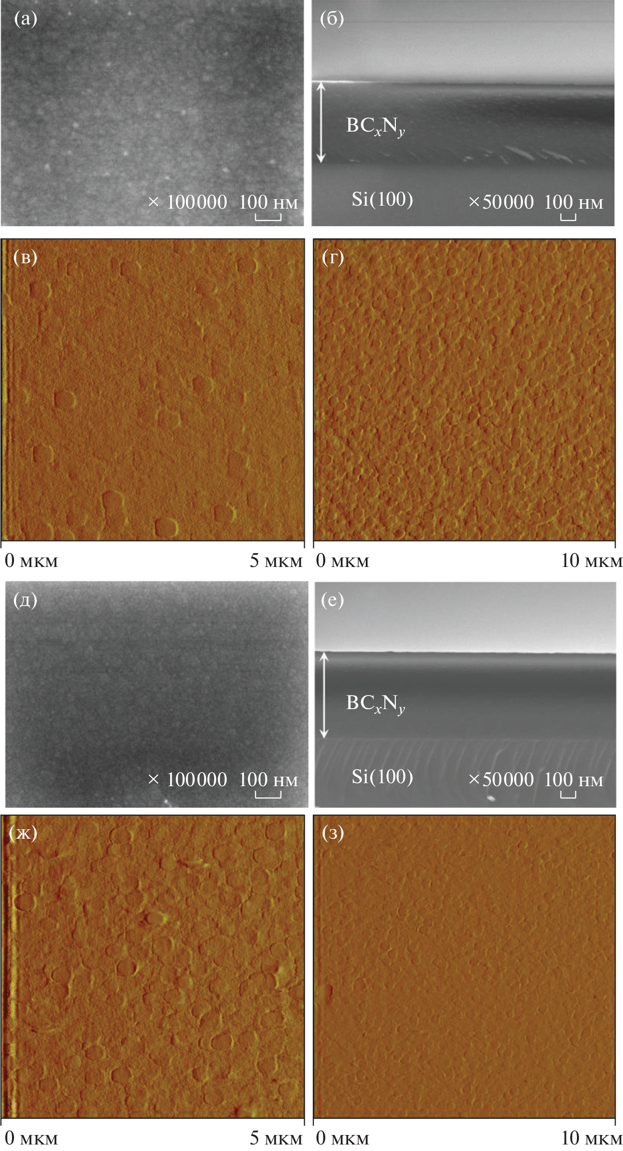 Tensimetric studies were carried out to determine temperature-dependent saturated vapor pressures and calculate thermodynamic characteristics of vaporization for R3N·BH3 (R = Me or Et) alkylamine boranes. These compounds have sufficient volatility and thermal stability to be used as precursors in vapor deposition processes to produce films based on phases of the B–C–N system. Triethylamine borane (TEAB) was used to synthesize boron carbonitride films at 773 and 873 K. The resulting layers were characterized by ellipsometry, atomic force and scanning electron microscopy, FTIR, Raman, and energy dispersive spectroscopies. The conditions for the production of continuous homogeneous films consisting of nanoparticles 20–60 nm in size aggregated into larger pseudohexagonal particles were determined. The surfaces of the films have an average and root mean square roughness, equal to 0.8 and 1.0 nm, respectively.