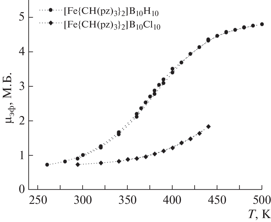Рассмотрены результаты синтеза и исследования магнитно-активных комплексов железа(II) с полиазотистыми гетероциклическими лигандами и внешнесферными кластерными анионами бора. В качестве лигандов представлены производные 1,2,4-триазола, трис(пиразол-1-ил)метана, 2,6-бис(1H-имидазол-2-ил)пиридина, в роли внешнесферных анионов исследованы декагидро-клозо-декаборат, додекагидро-клозо-додекаборат, декахлор-клозо-декаборат, 1,5,6,10-тетра(R)-7,8-дикарба-нидо-ундекабораты (R = H, Cl, Br). Получен ряд комплексов железа(II), в котором проявляется спин-кроссовер, в большинстве случаев сопровождающийся термохромизмом. Рассмотрено влияние природы лиганда и кластерного аниона на температуру (Тс) и характер спинового перехода. В частности, показано, что введение в состав кластерного аниона заместителя, повышающего электронную плотность по системе сопряженных трехцентровых двухэлектронных связей, приводит к увеличению силы поля лиганда, который связан с анионом сетью водородных связей.