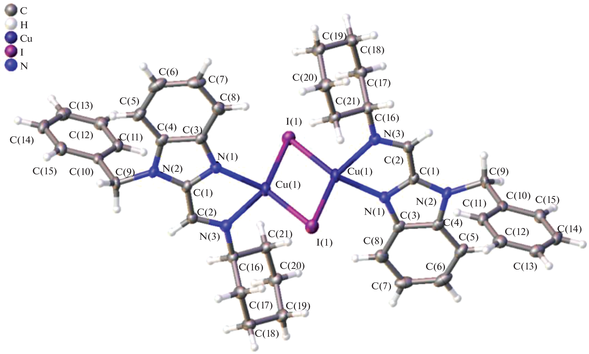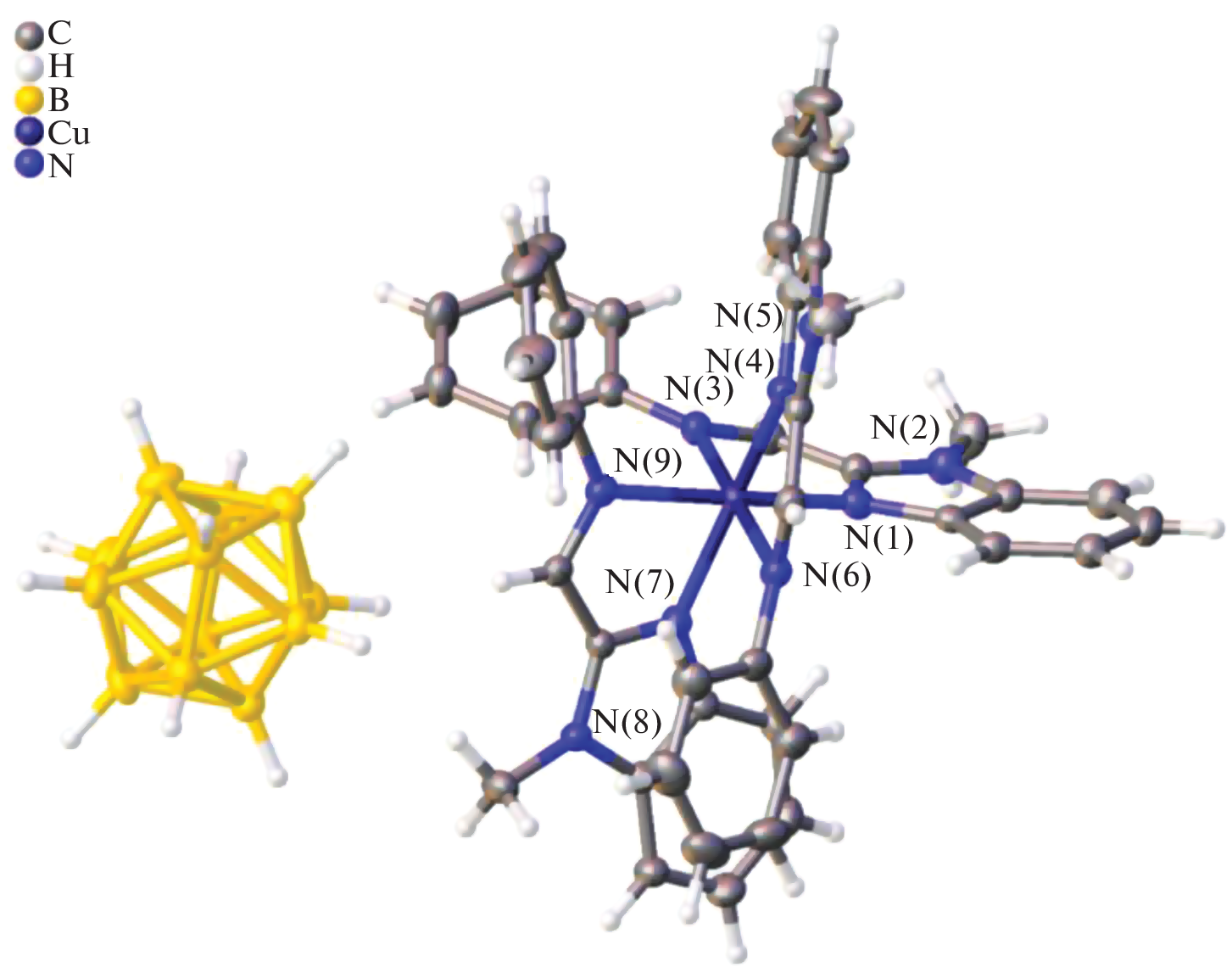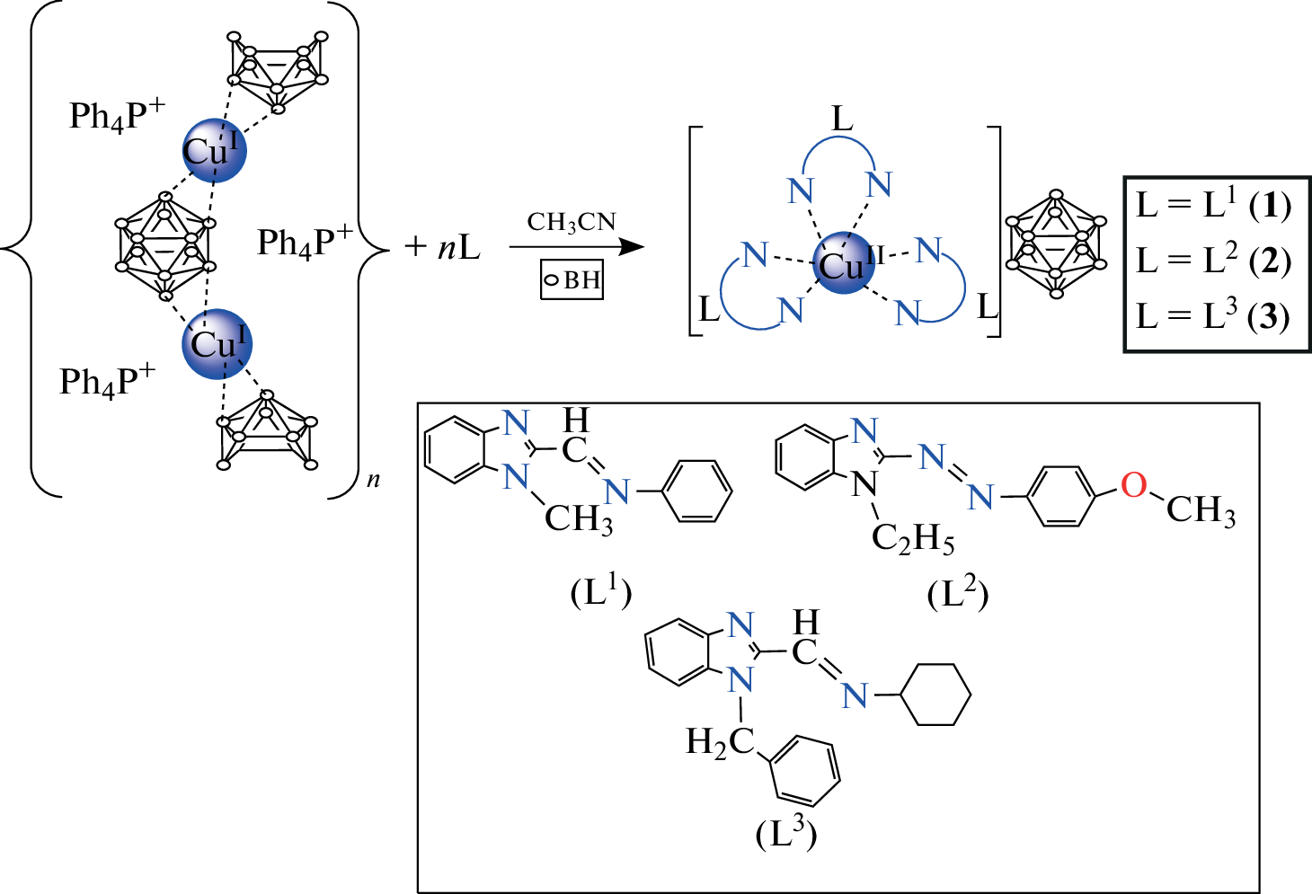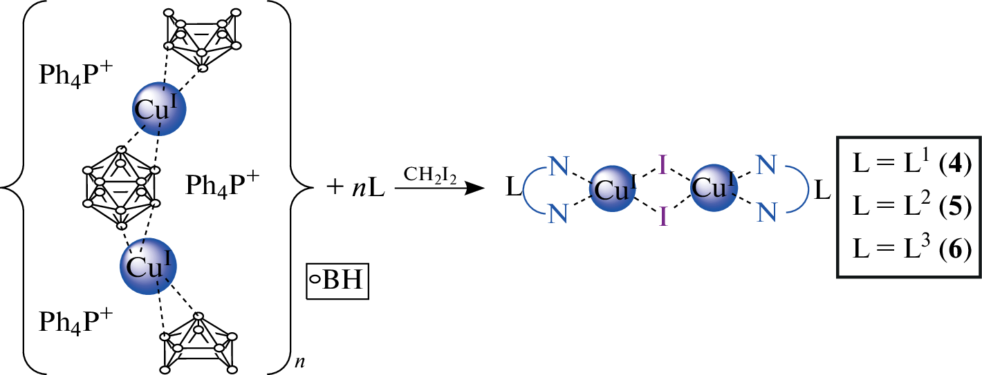 The process of copper(I) complexation with organic ligands as luminophores 1-(1-methylbenzimidazol-2-yl)-N-phenylmethanimine (L1), 1-ethyl-2-(4-methoxyphenyl)azobenzimidazole (L2), and 1-(1-benzylbenzimidazol-2-yl)-N-cyclohexylmethanimine (L3) in the presence of the closo-dodecaborate anion [B12H12]2– has been studied. It has been shown that in acetonitrile, a redox reaction proceeds to form copper(II) tris-chelate complexes [CuIIL3][B12H12]. Using diiodomethane as a solvent, we have succeeded in stabilizing copper in the +1 oxidation state; as a result, mixed-ligand binuclear complexes [CuI2L2(μ-I)2] containing no boron cluster anion have been isolated. The structures of complexes [CuII(L1)3][B12H12] and [CuI2(L3)2(μ‑I)2] have been determined by X-ray diffraction.