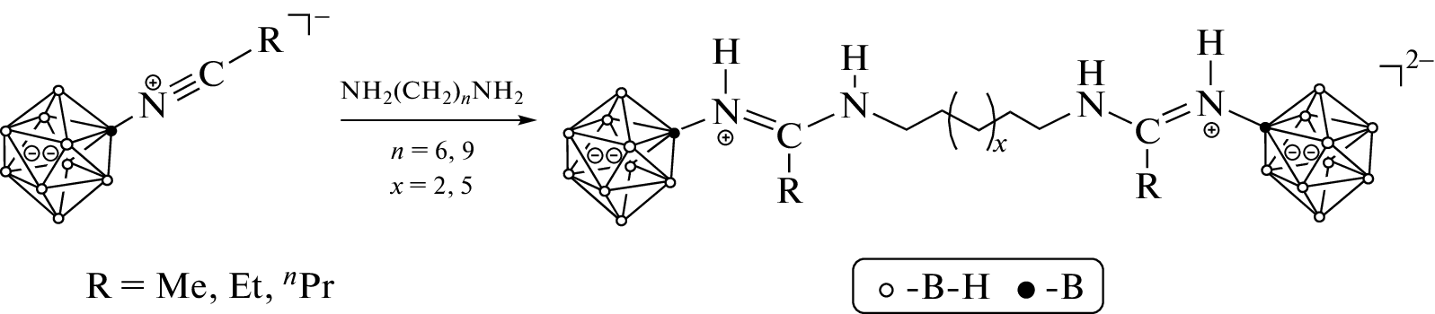 The reaction of a number of nitrilium derivatives of the closo-decaborate anion with hexamethylene- and nonamethylenediamine has been studied. It has been shown that the process proceeds with the functionalization of both amino groups of the nucleophile to form amidines of the type (Bu4N)2[B10H9NH=C(R)NH (CH2)nNH(R)C=NHB10H9] (R = CH3, C2H5, nC3H7; n = 6, 9). Target compounds have been characterized by high resolution multinuclear NMR and ESI mass spectrometry.