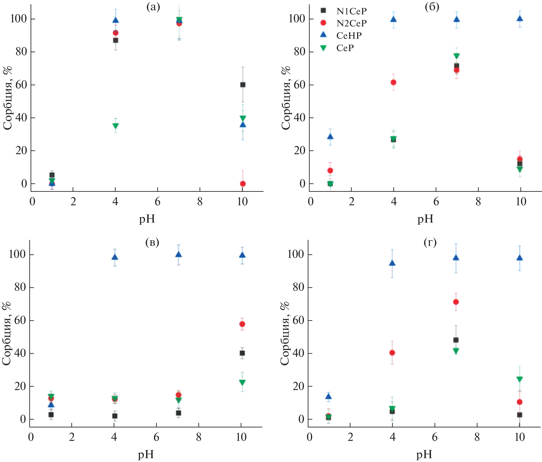 Изучены сорбционные свойства аморфного гидроортофосфата церия(IV) и кристаллических фаз NH4Ce2(PO4)3, (NH4)2Ce(PO4)2·H2O, Ce(OH)PO4 в водных средах при рН 1, 4, 7 и 10 по отношению к радионуклидам 243Am(III), 232Th(IV), 237Np(V) и 233, 238U(VI) в течение суток. Показано, что наибольшей степенью сорбции (до 100%) характеризуется аморфный гидроортофосфат церия(IV), при этом зависимости сорбции радионуклидов от величины рН для кристаллических соединений близки между собой: максимальные значения наблюдаются при рН 7 (до 100% для 243Am(III)), минимальные ‒ при рН 10 и 1. Исключение составляет 237Np(V), для которого сорбция близка к нулю в диапазоне рН 1–7, а при рН 10 достигает 60%. Выдержка аморфного и кристаллических ортофосфатов церия(IV) в кислой среде приводит к количественной десорбции всех исследуемых радионуклидов в течение первых 5 ч.