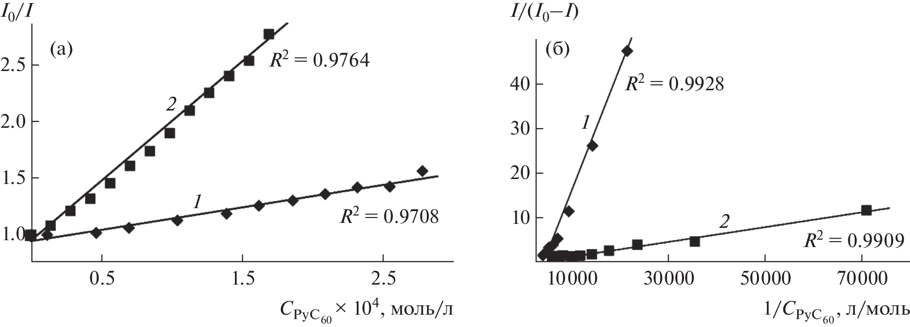 New complexes of [5,10,15,20-tetra-(4-methoxyphenyl)porphinato](chloro)indium(III) ((Cl)InTPP(p-OCH3)4) with unsubstituted C60 and 1-methyl-2-(pyridin-4'-yl)-3,4- fullero[60]pyrrolidine (PyC60) were synthesized in toluene. The stability constants of 1 : 1 complexes (dyads) were determined using UV-vis and fluorescence spectroscopy. The dyads were characterized by IR and 1H NMR spectroscopy data. It was established that fluorescence of (Cl)InTPP(p-OCH3)4 is quenched upon gradual addition of fullerenes. The numerical values of the Stern–Volmer quenching constants (KSV) were determined. The most important charge transfer characteristics of dyads (the lifetime of charge-separated states and charge separation and recombination constants), needed for further consideration of dyads based on indium(III) porphyrins as photoinduced electron transfer systems, were determined using femtosecond laser spectroscopy.