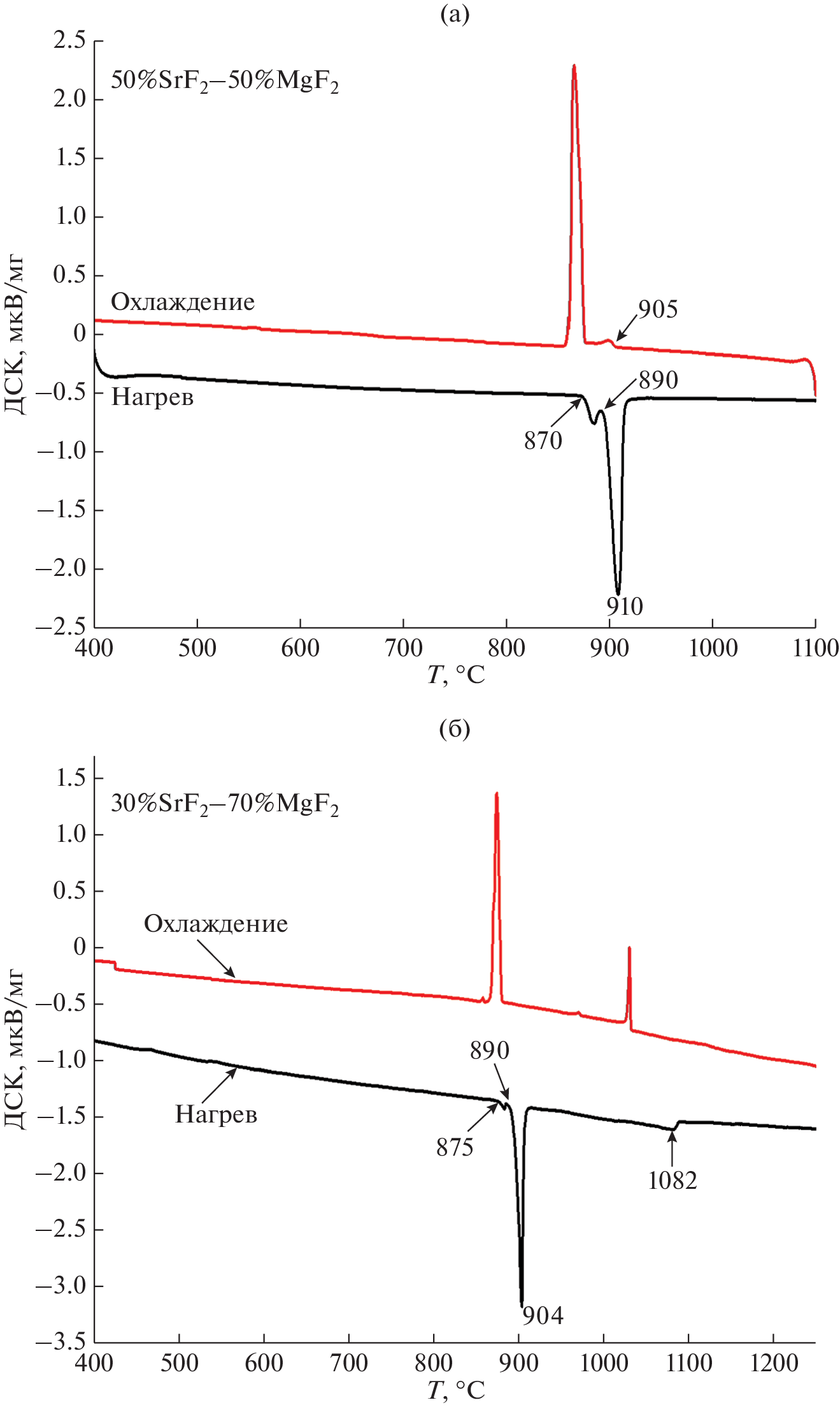The phase diagram of the SrF2–MgF2 system has been studied by differential thermal analysis (DTA) and X-ray powder diffraction (XRD). The stability area of the compound SrMgF4 is very small, and its extent is about 20°С between 870 and 890°С. The formation of compounds by magnesium fluoride and strontium fluoride with other metal fluorides is considered in the M versus X coordinates, where M is the cumulative moment of the cation and X is the cation electronegativity. Two areas of compound formation were identified for each of the fluorides. Magnesium and strontium fluorides are amphoteric compounds in terms of the Lewis acid and base theory.