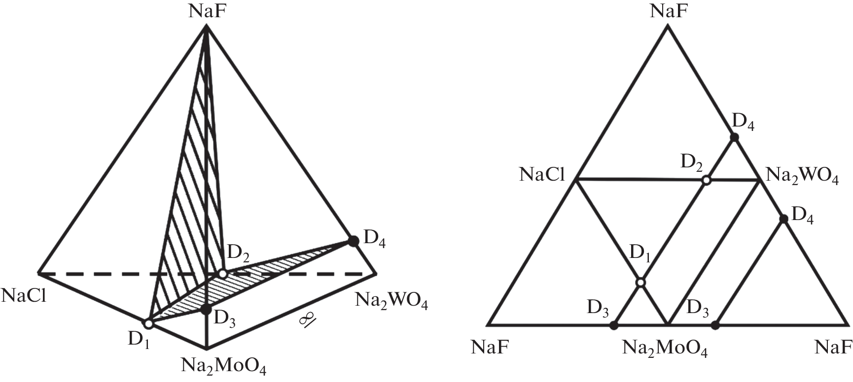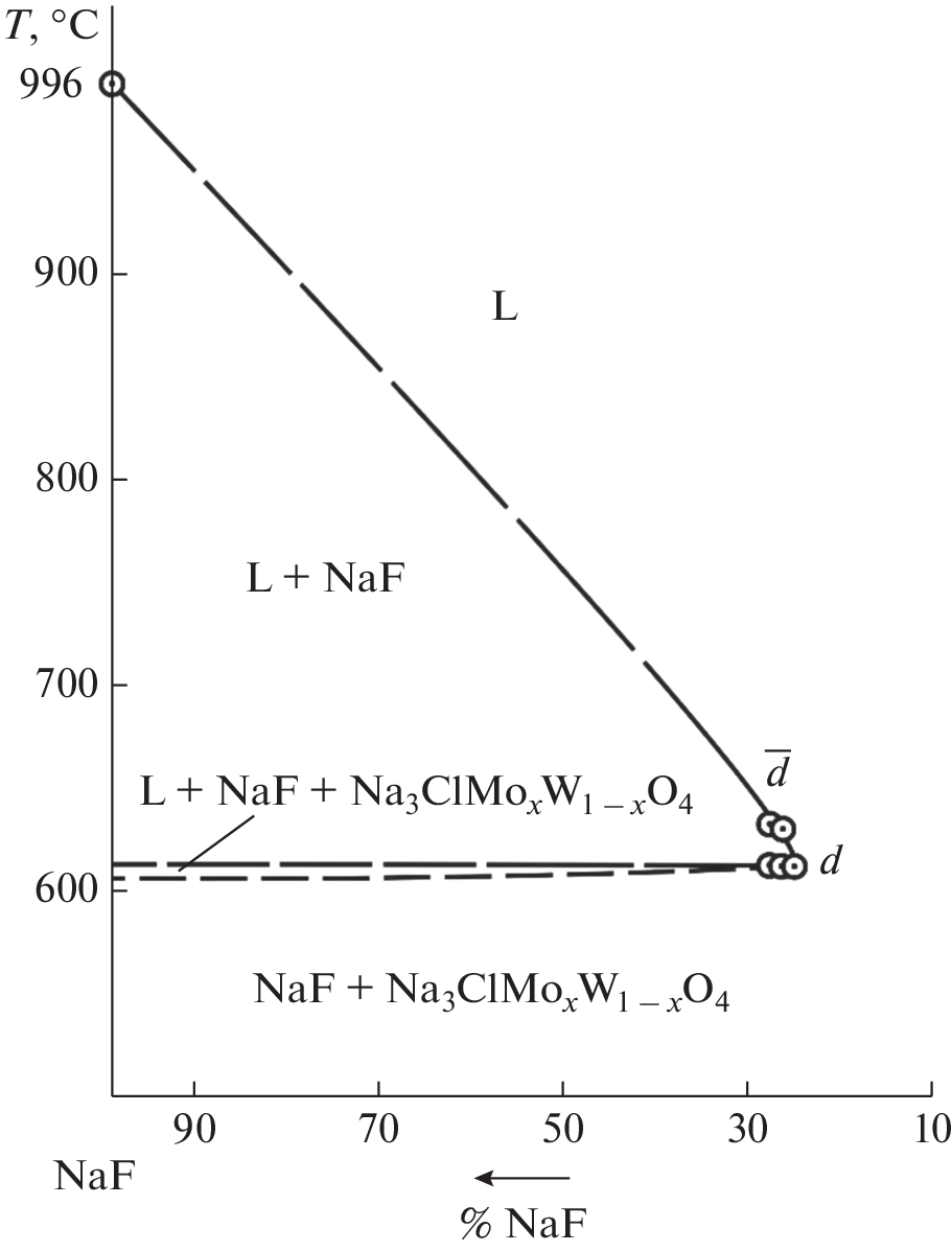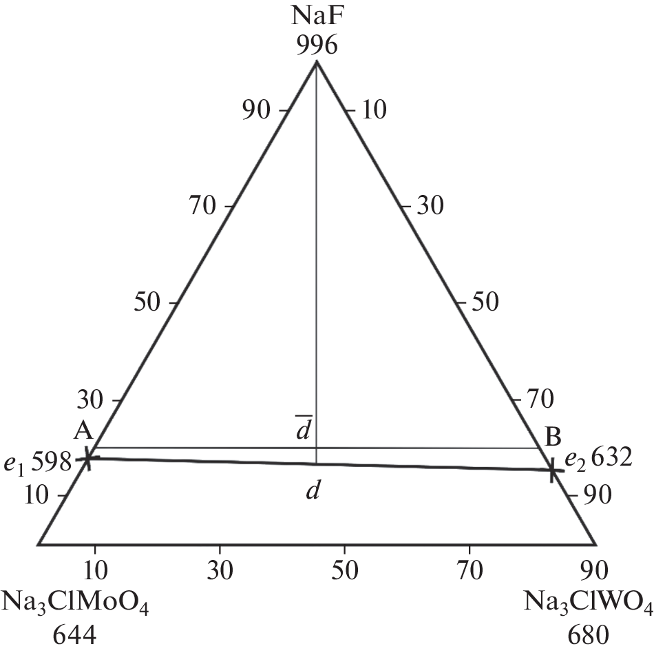 Theoretical and experimental studies of the NaF–Na3ClMoO4–Na3ClWO4 stable secant triangle of the NaF–NaCl–Na2MoO4–Na2WO4 four-component system have been carried out. The review of the literature concerned with the boundary elements of the title system has shown two options for the numbers and compositions of crystallizing phase: in case the solid solutions are stable, two solid phases would be formed, and in case of their decay, three solid phases would. The experimental tools used to study the NaF–Na3ClMoO4–Na3ClWO4 system were differential thermal analysis (DTA) and X-ray powder diffraction (XRD). The melting point and composition of the mixture that correspond to point d, which lies on monovariant curve e1e2 connecting binary eutectics, have been determined. X-ray powder diffraction showed two solid phases, namely, NaF and Na3ClMoxW1 – xO4 continuous solid solutions (CSS), in an alloy of point d composition. The nonexistence of invariant points in the title system has been shown. The CSS based on Na3ClMoO4 and Na3ClWO4 are stable. The projection of the phase assemblage of the system on the composition triangle is represented by two crystallization fields of the terminal components: a sodium fluoride field, which is the dominant one, and a Na3ClMoxW1 – xO4 CSS field.