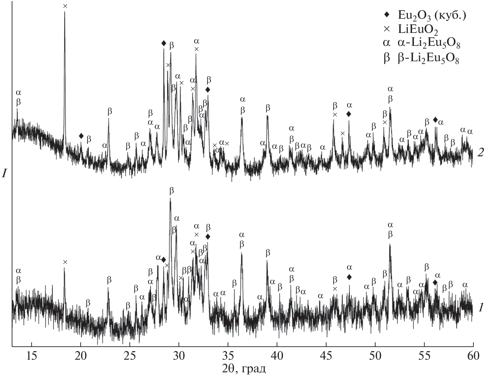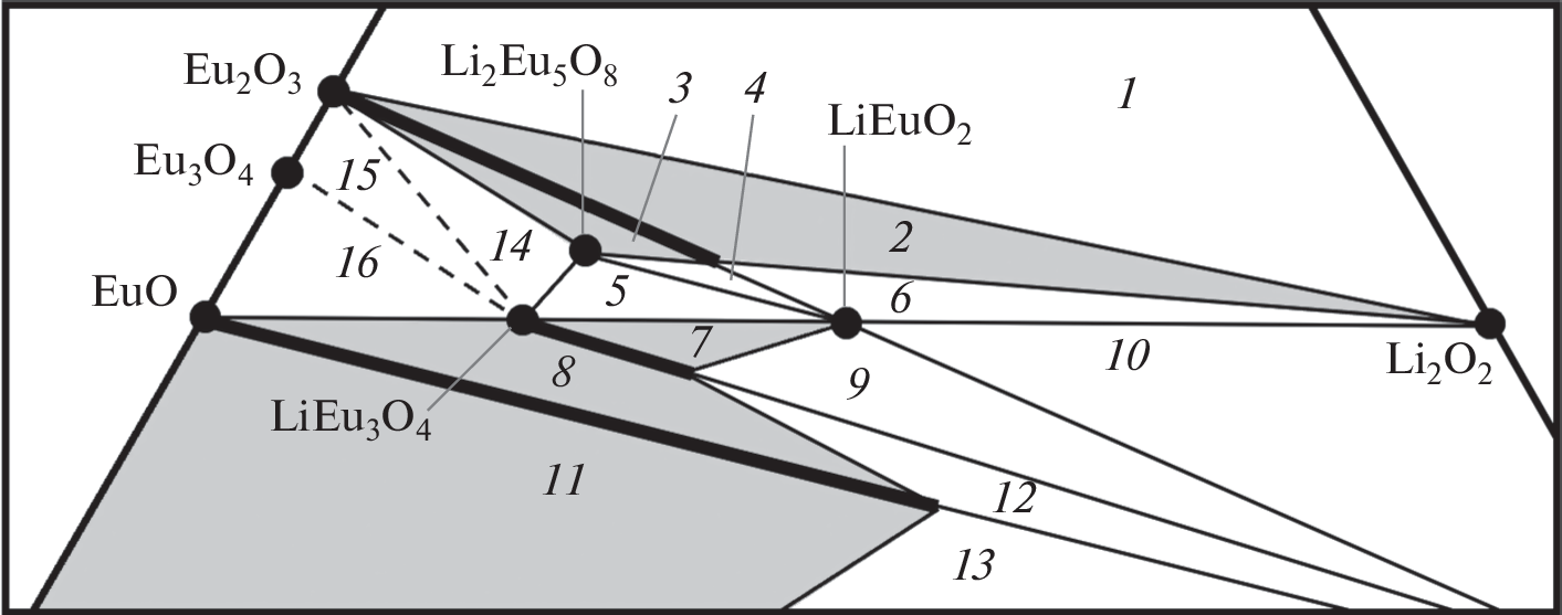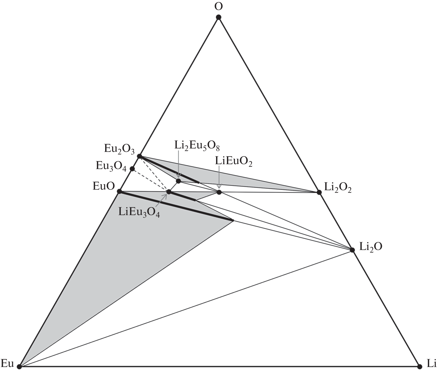, it is 30% of the total amount of cations. Along with LiEuO2, the formation of crystalline mixed-valent (EuII + EuIII) phases LiEu3O4 and Li2Eu5O8 has been confirmed. The thermal behavior of solid solutions Eu1 – xLixO1 – δ based on europium monoxide and Li1 + yEu3O4 – γ in air has been studied. The concentration phase diagram of the Li–Eu–O system has been constructed.