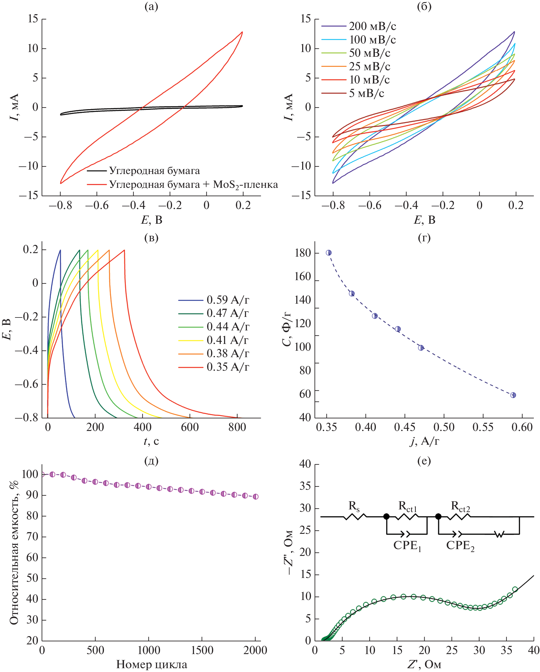 The formation of hierarchically organized MoS2 films on various substrates by a hydrothermal method was studied. The influence of synthesis conditions and the substrate (a glass or a flexible carbon paper substrate) on the crystal structure of sulfide films was determined using X-ray powder diffraction (XRD). Scanning electron microscopy (SEM) showed that the films on glass substrates comprised structurally different elements, namely a continuous dense layer of spherical nanoparticles on the surface of which hierarchically organized globular agglomerates of two types are arranged. A molybdenum disulfide shell about 1.5 μm thick, consisting of hierarchically organized nanosheets less than 10 nm thick, was formed on the surface of carbon fibers that make up the carbon paper. Elemental mapping was used to evaluate the homogeneity of the MoS2 film formed on the carbon paper. Atomic force microscopy (AFM) showed that an individual carbon fiber modified with a sulfide film had a mean square roughness of about 13 nm (over an area of about 100 μm2). According to Kelvin-probe force microscopy (KPFM) data, the electron work function of the material was 4.53 eV. The electrochemical characteristics of the manufactured flexible electrode based on a hierarchically organized molybdenum disulfide film were investigated. The specific capacitance and the stability of functional and microstructural properties of the manufactured supercapacitor electrode in 2000 charge–discharge cycles were evaluated. Thus, the proposed strategy is promising for the fabrication of efficient hierarchically organized MoS2 electrodes for flexible supercapacitors.