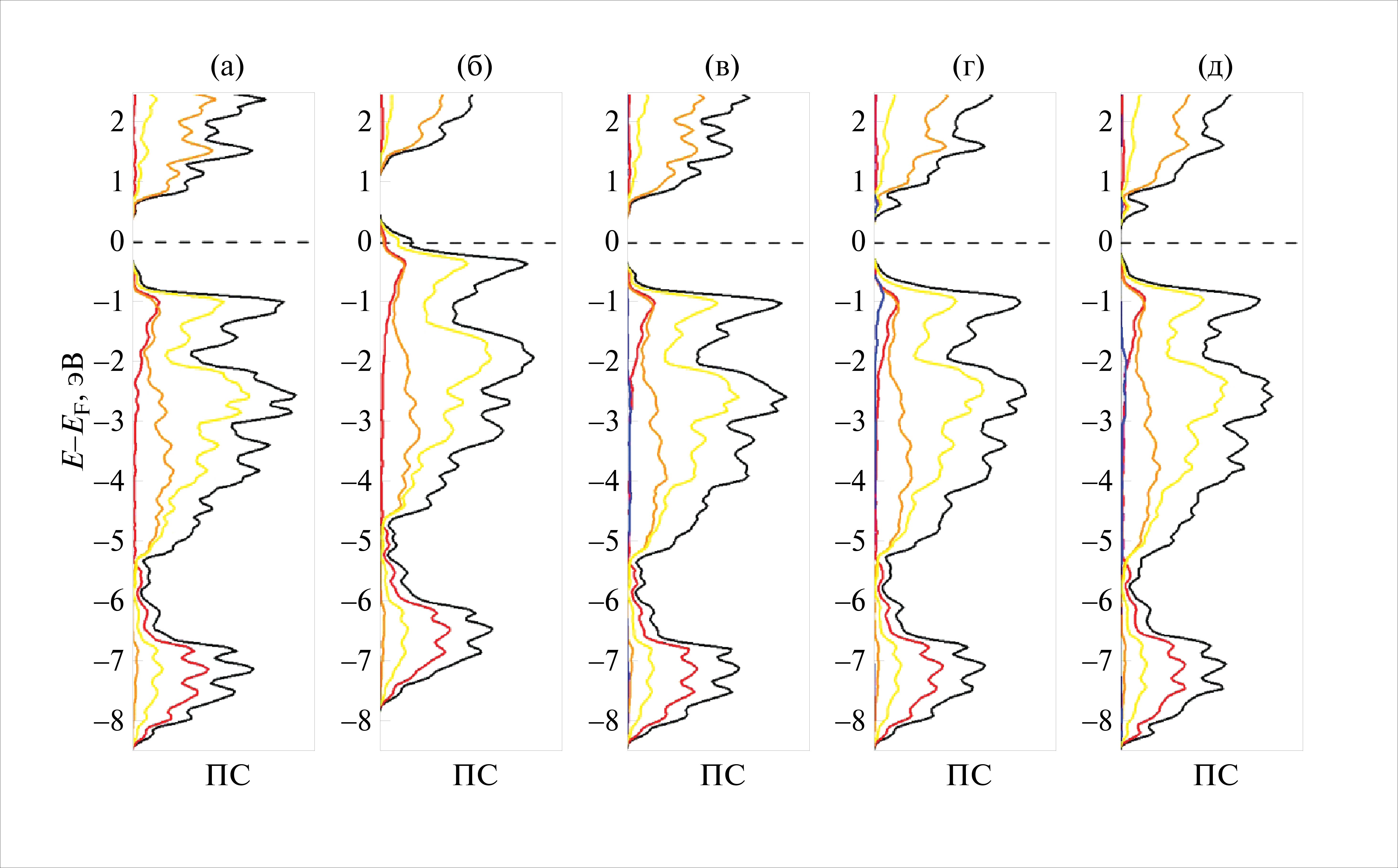 Рис. 6. Плотность электронных состояний (ПС) для слэбов (001)SnS в случае комплектного состава и решетки (a) и в случае дефектов: SnS с вакансиями в подрешетке Sn (б), SnS с замещением S на O (в), SnS с адсорбированными атомами S (г) и SnS с адсорбированными атомами O (д). Sn5s-, Sn5p- и S3p-состояния обозначены соответственно красным, оранжевым и желтым цветом. O2p- или S3p-состояния примесей замещения или адсорбатов обозначены синим цветом. Расчеты DFT GGA.