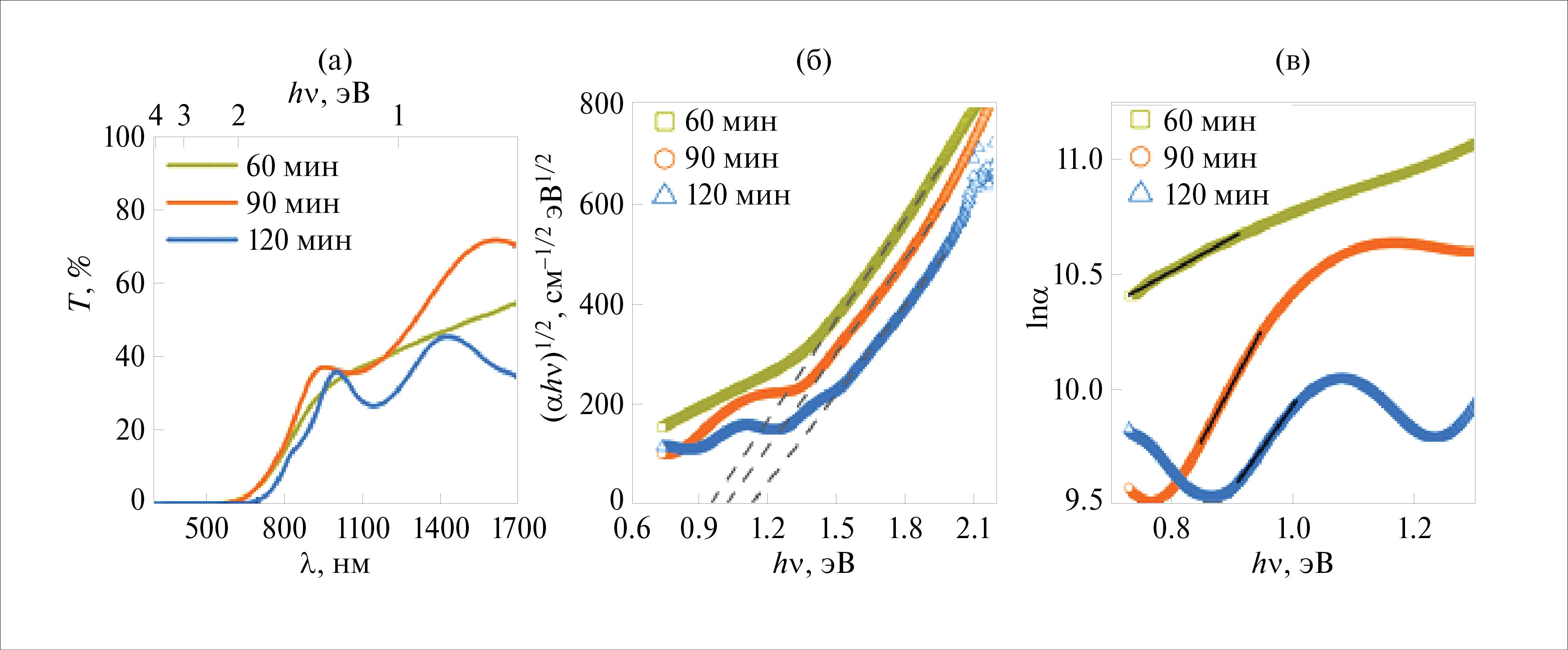 Спектры светопропускания (T(ë)) тонких пленок SnS представлены на рис. 7а. По мере увеличения длительности осаждения происходит усложнение формы спектров: наряду с характерными областями спада, возникающими в результате межзонных электронных переходов в фазе SnS, в спектрах образцов присутствуют явные интерференционные полосы. Появление последних указывает на высокую степень кристалличности и гладкую поверхность слоев, полученных при продолжительном осаждении. Для всех образцов существенное снижение светопропускания наблюдается в диапазоне длин волн 560–1010 нм (1.2—2.2 эВ), что связано с увеличением вероятности электронных переходов из валентной зоны в зону проводимости. Обсуждаемая область спада немного смещена в сторону больших длин волн для пленки, синтезированной в течение 120 мин. При ë < 560 нм для всех слоев наблюдается существенное поглощение падающего излучения. Рассчитанный коэффициент поглощения á достигает своих максимальных значений 7.5 ×105, 5.6 ×105 и 2.4 ×105 см−1 для образцов, осажденных в течение 60, 90 и 120 мин соответственно.